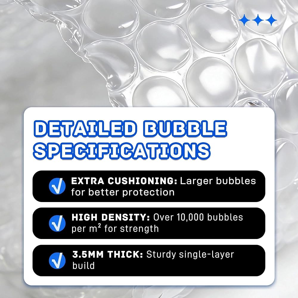 مواصفات الفقاعات التفصيلية - تتميز الفقاعات بزيادة ملحوظة في الارتفاع والقطر مقارنة ببعض الخيارات الشائعة، وتستخدم الحقيبة كثافة فقاعات تتجاوز 10000 لكل متر مربع. تم تحديد سمك الطبقة الواحدة بـ 3.5 ملم