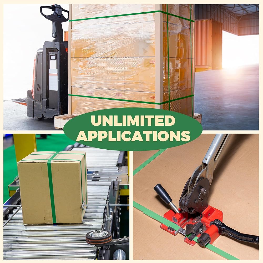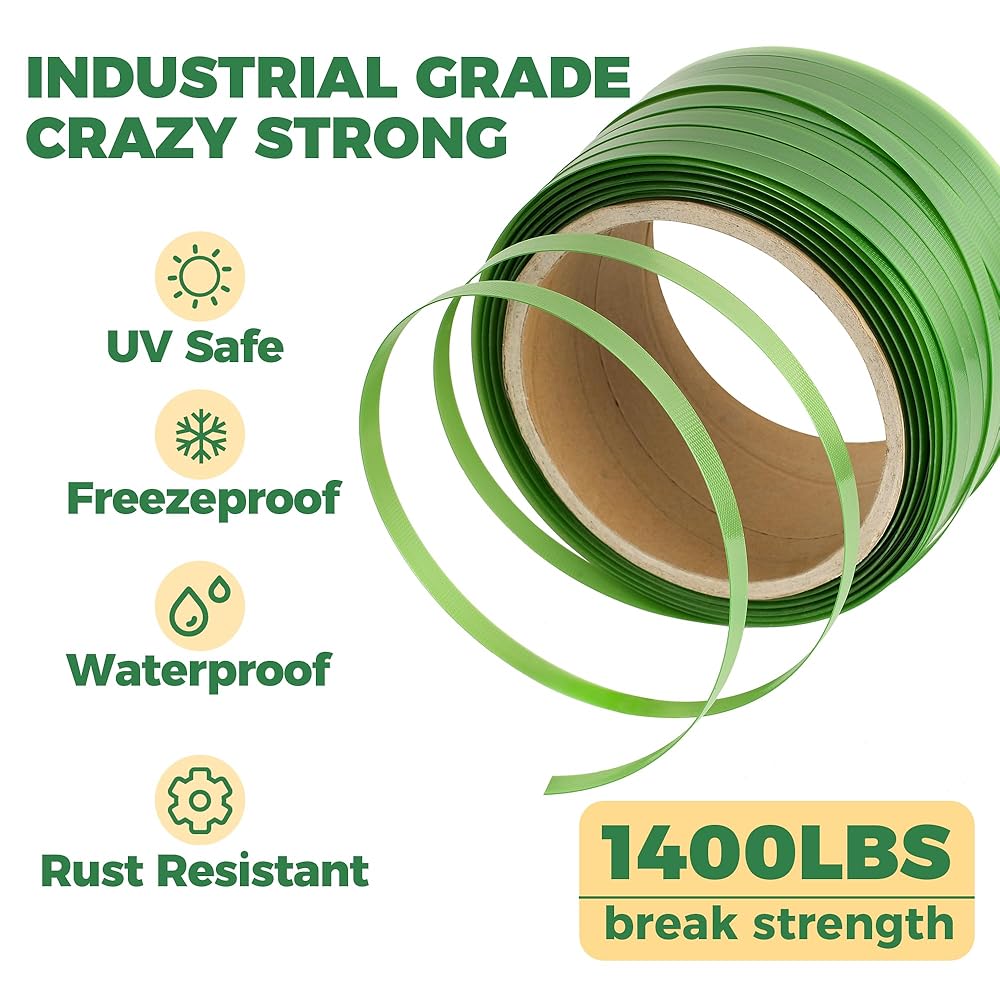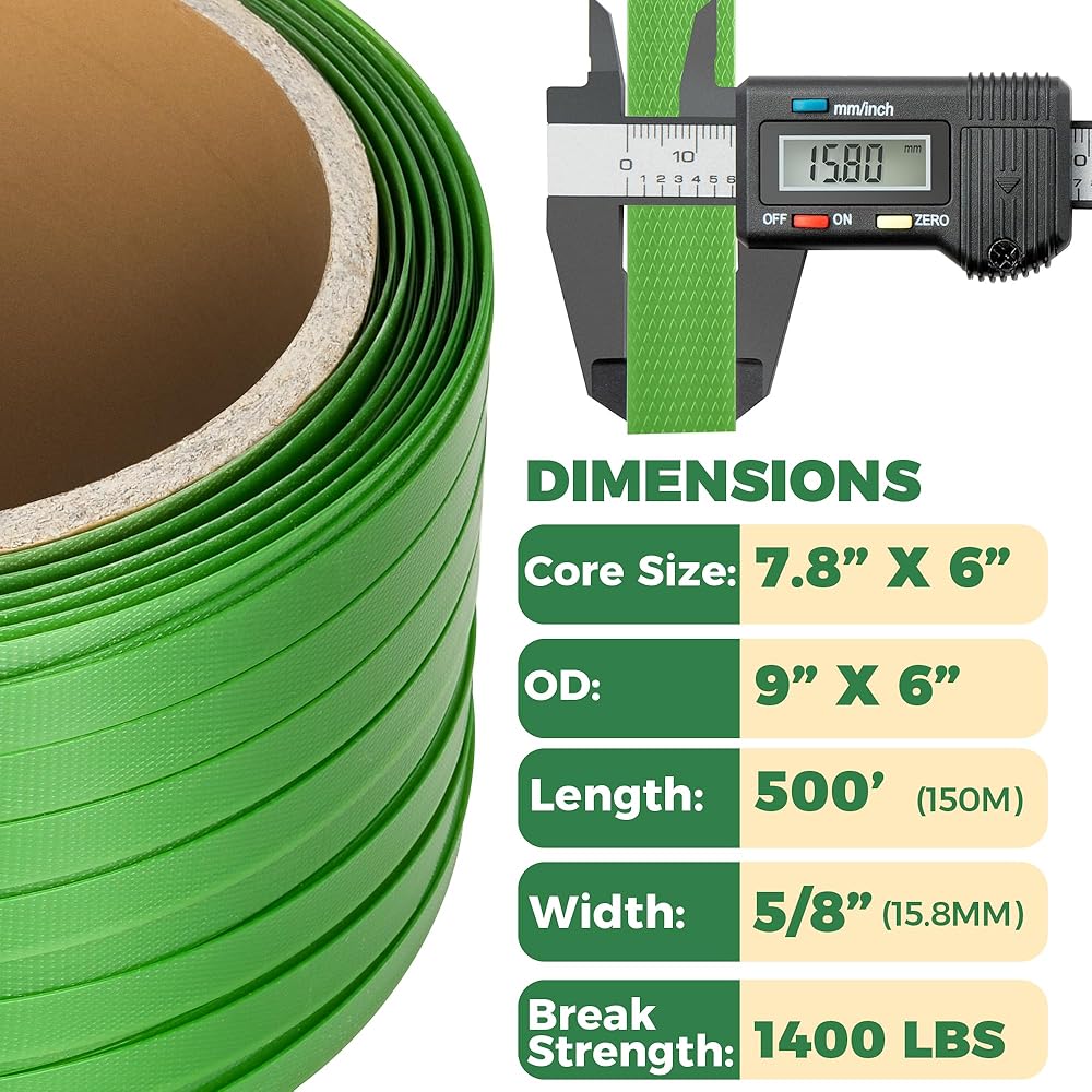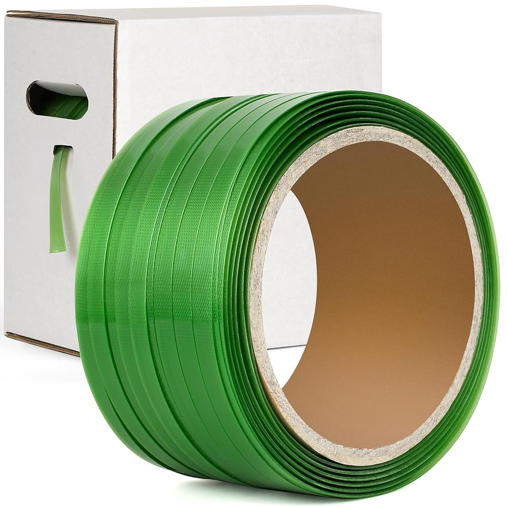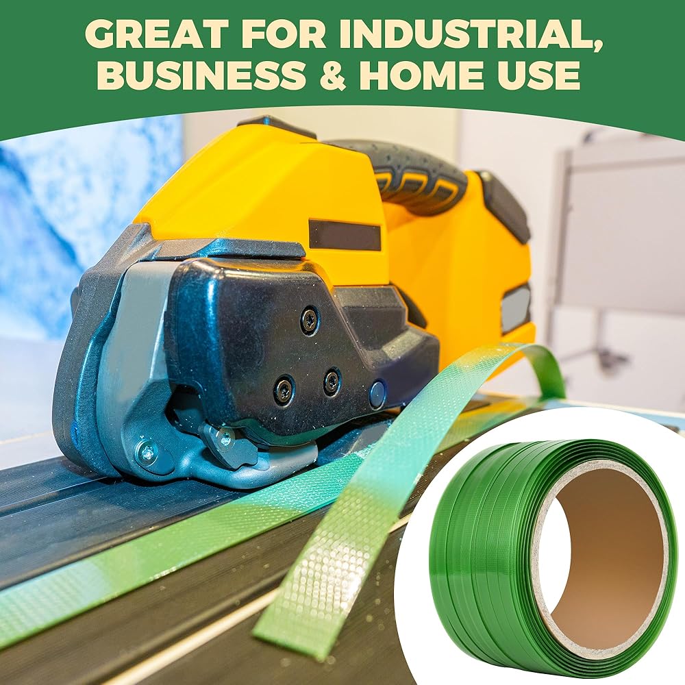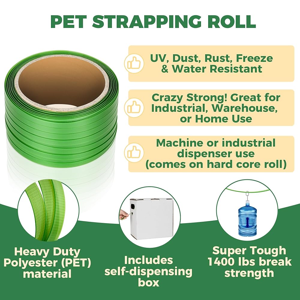بكرة ربط شديدة التحمل للتغليف والربط - بوليستر أخضر من الدرجة الصناعية PET، 500 قدم × 5/8 بوصة × 0.035 بوصة ملف حزام منصة نقالة بقوة 1400 رطل، مقاومة للصدأ مع مجموعة صندوق التوزيع الذاتي