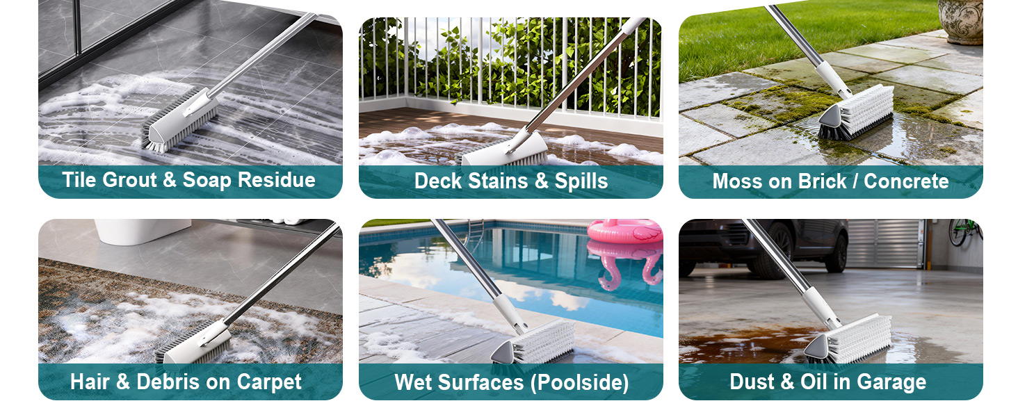 الفرك الرطب أو الجاف للاستخدام متعدد الأسطح__ يعمل كفرشاة تنظيف للأرضيات المبللة لغسل الخرسانة والبلاط والأرضيات المغلقة، أو كفرشاة جافة لكنس الحطام. مناسب للمناطق ذات حركة المرور الكثيفة المعرضة للزيت والغبار وآثار الأقدام وأوساخ الفناء.
