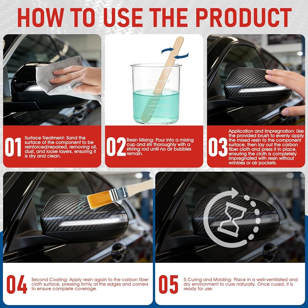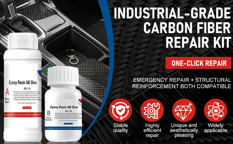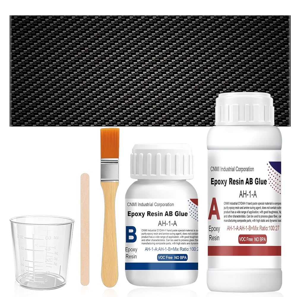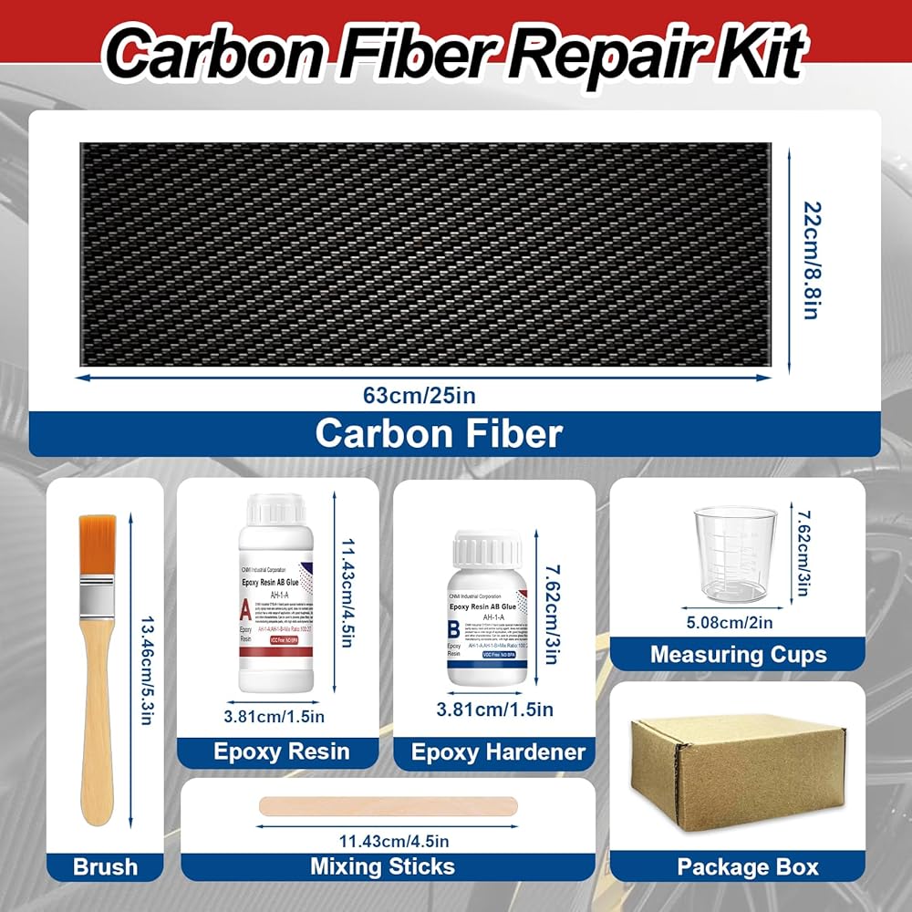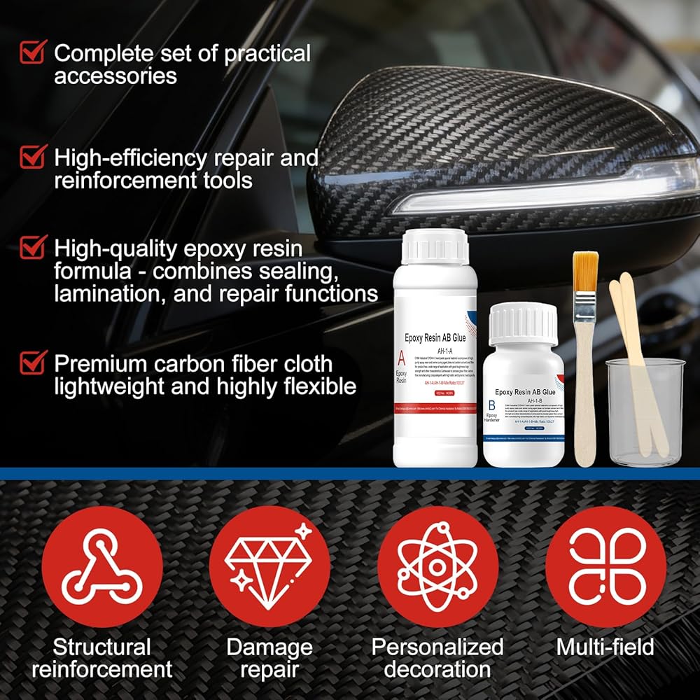 طقم إصلاح ألياف الكربون: تشتمل مجموعة راتنجات الإيبوكسي المصنوعة من ألياف الكربون على قطعة قماش من ألياف الكربون 3K 200 جرام (20 سم × 6 سم)، وراتنج إيبوكسي 100 جرام ومقوي 27 جرام، وكوب قياس 60 مل وعصي تقليب وفرشاة. يتضمن كل ما تحتاجه ويحقق إصلاحًا سلسًا