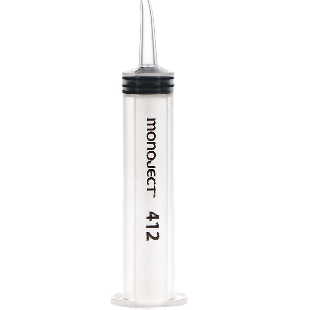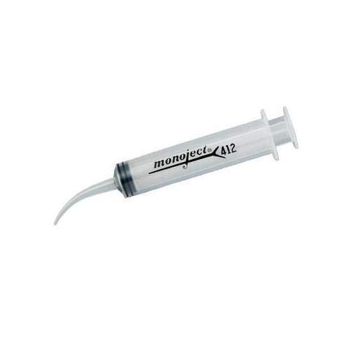 Monoject Irrigation Syringe #412, 12cc with Curved Tip, Non-Sterile, Box of 50 Syringes. Used for pressure irrigation. Disposable for easy cleanup. Curved tip design for improved access. Reusable finger grips. The Monoject 412 Syringes are non-sterile, disposable plastic instruments used to dispense various dental impression materials and are perfect for pressure irrigation. These ungraduated syringes can hold 12 ccs and feature curved tips for better access and plastic finger grips that can be reused.