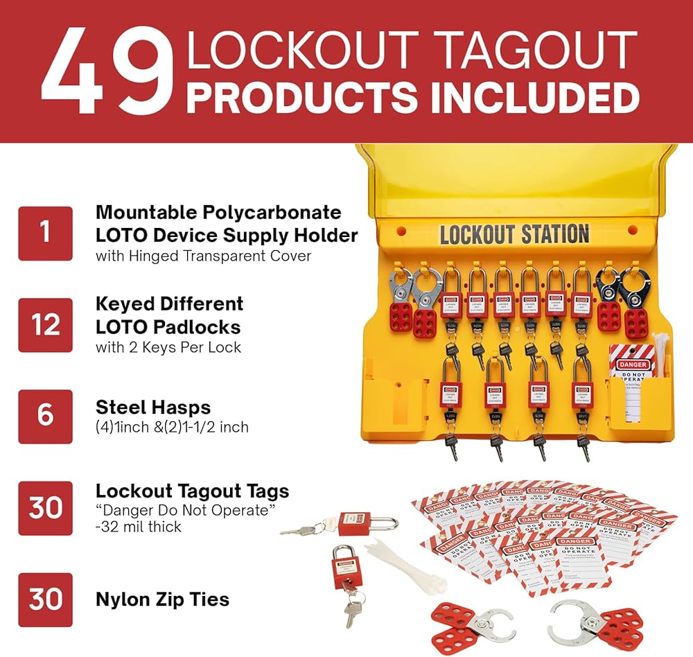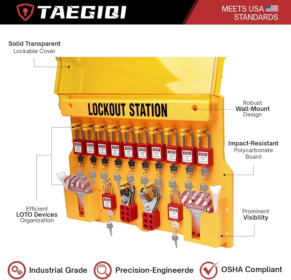 محطة تاجوت للقفل من TAEGIQ مع أجهزة لوتو، لوحة أدوات قفل الخروج، مجموعة أقفال أمان مكونة من 12 قطعة، 6 مشابك لوتو، 30 علامة لا تعمل للامتثال لإدارة السلامة والصحة المهنية