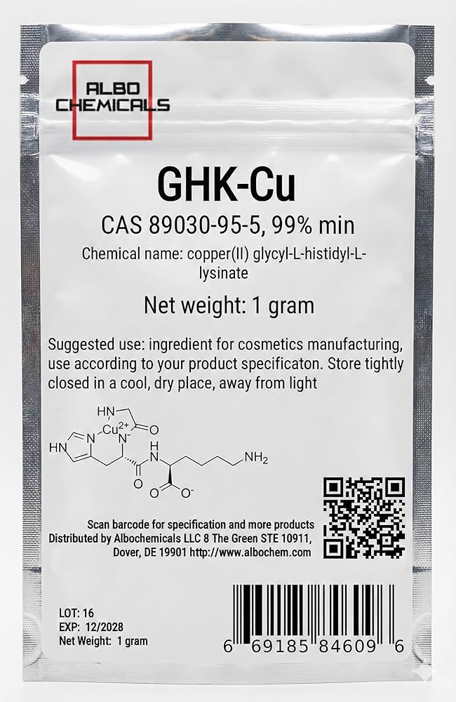 GHK-CU Copper Peptide Powder, 99% min, CAS 89030-95-5, 1 gram Chemical name: copper(II) glycyl-L-histidyl-L-lysinate