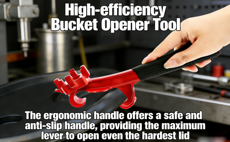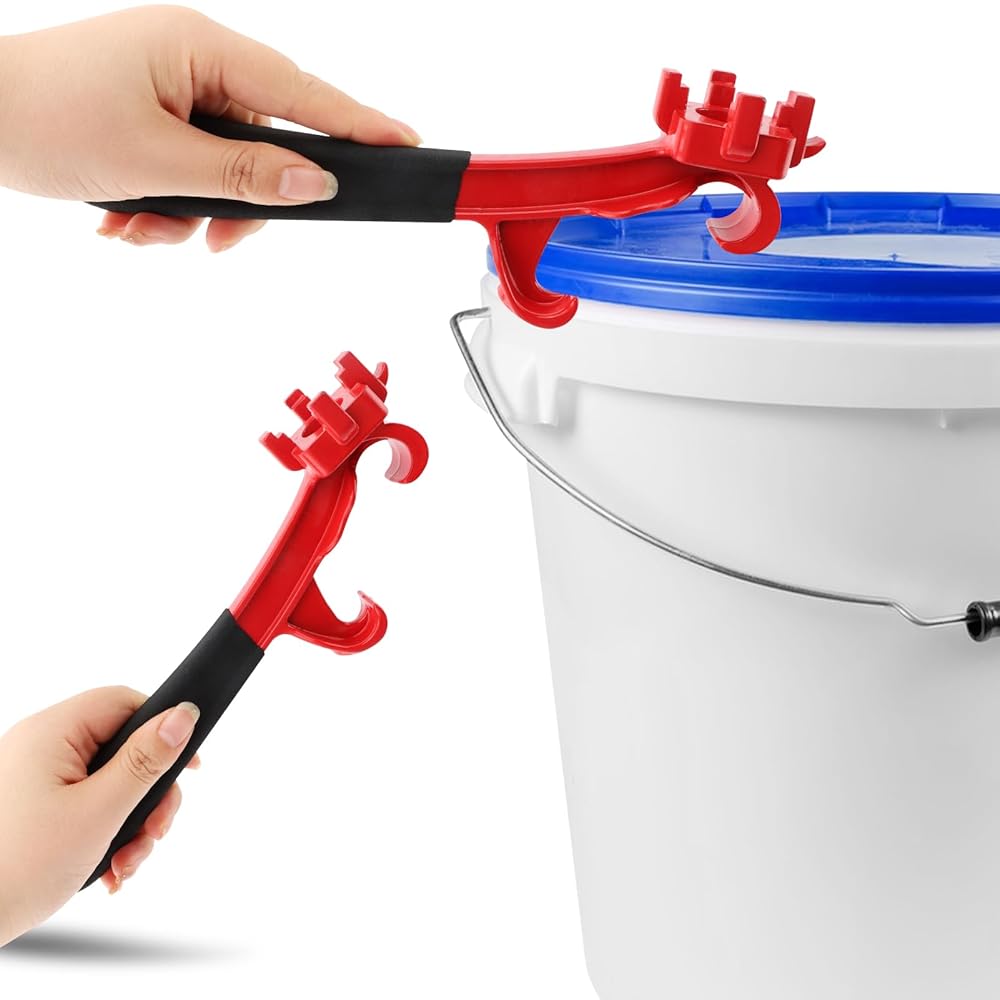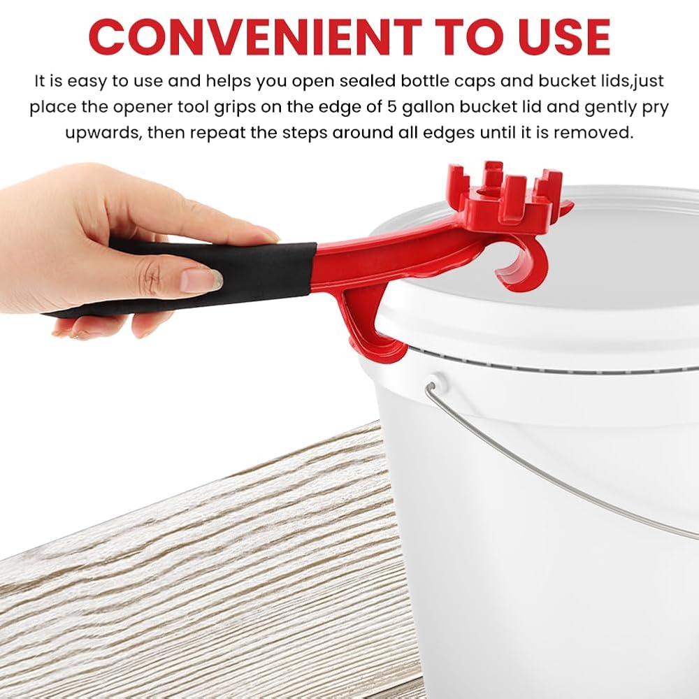إزالة الغطاء بدون مجهود: كفتاحة دلو سعة 5 جالون، ارفع بلطف لأعلى على طول حافة الغطاء مع الفتحة السفلية للأداة، ثم كرر الخطوات المذكورة أعلاه على جميع الحواف حتى تزيل الغطاء؛ كمفتاح ربط بسعة 55 جالون، استخدم الجزء الموجود فوق الأداة لإدخال قابس الغطاء، وقم بتدوير الغطاء بسهولة؛ كفتاحة علب معدنية، استخدم الجزء الأمامي من الأداة لفتح الغطاء