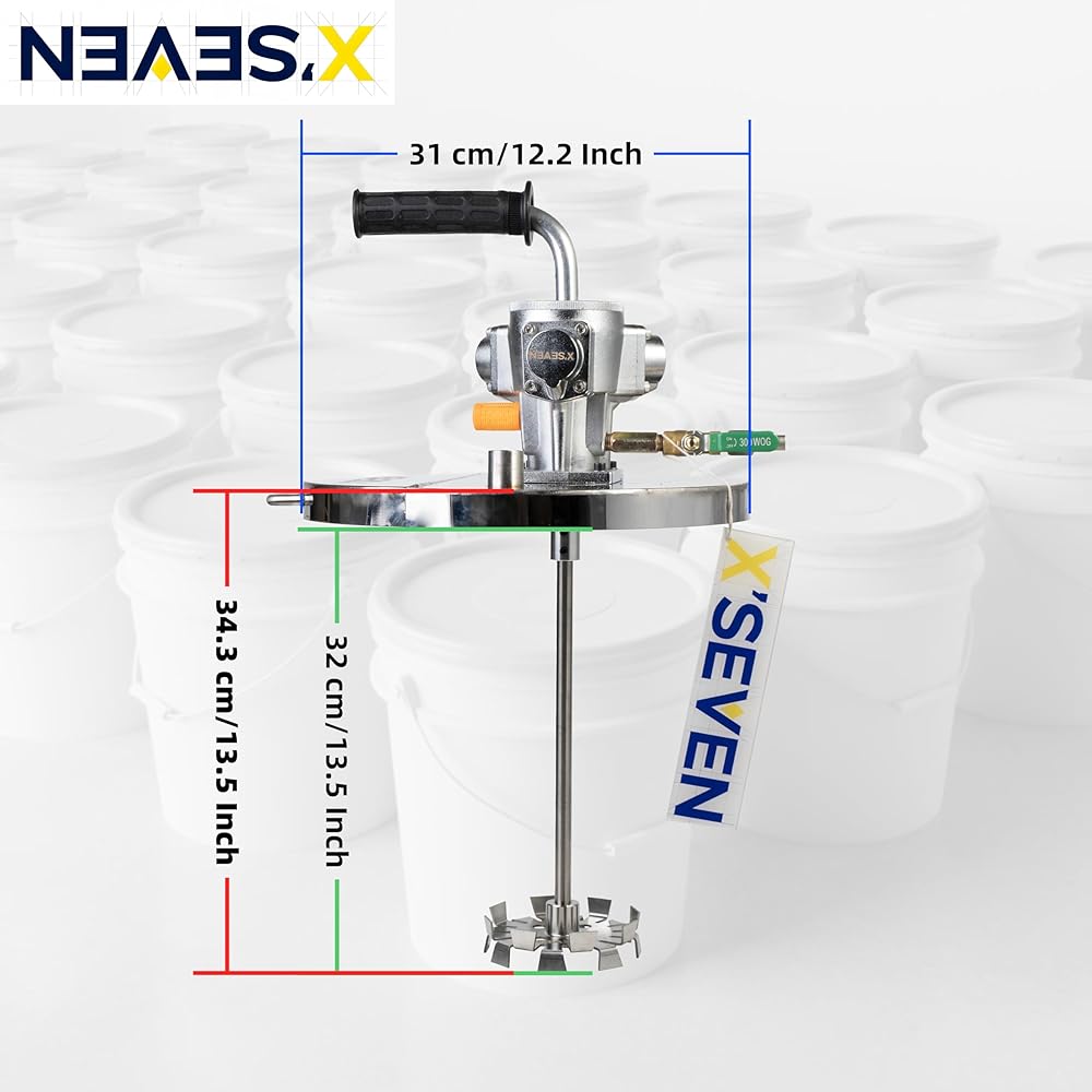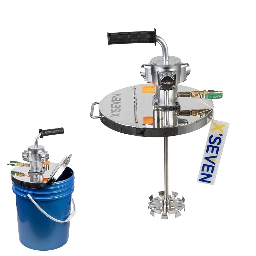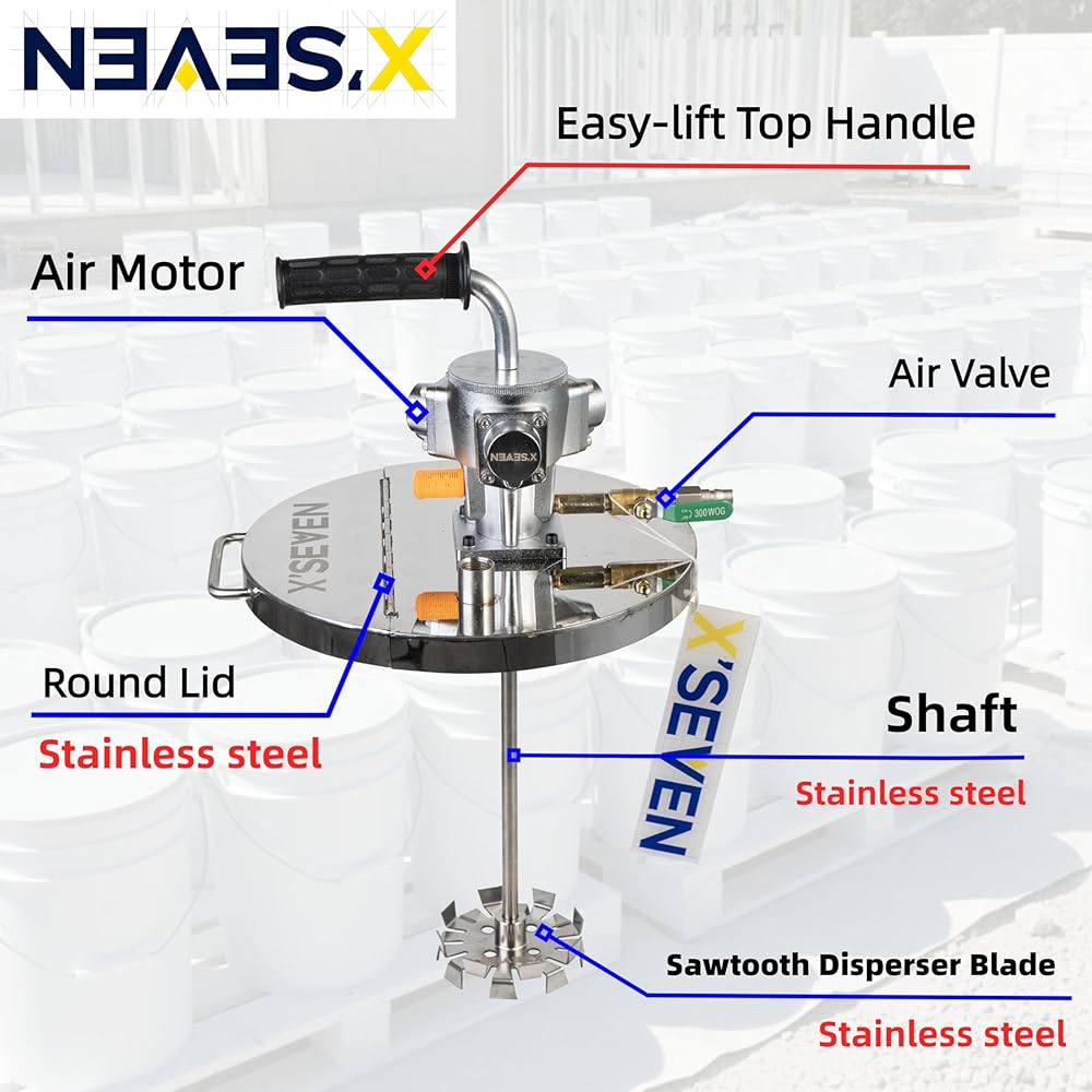 سرعة قابلة للتعديل لمواد مختلفة - يمكن تعديل سرعة الخلط وكثافته باستخدام صمام الهواء أو المنظم، من الدوران الأبطأ إلى التشتت الأقوى في دلاء سعة 5 جالون.