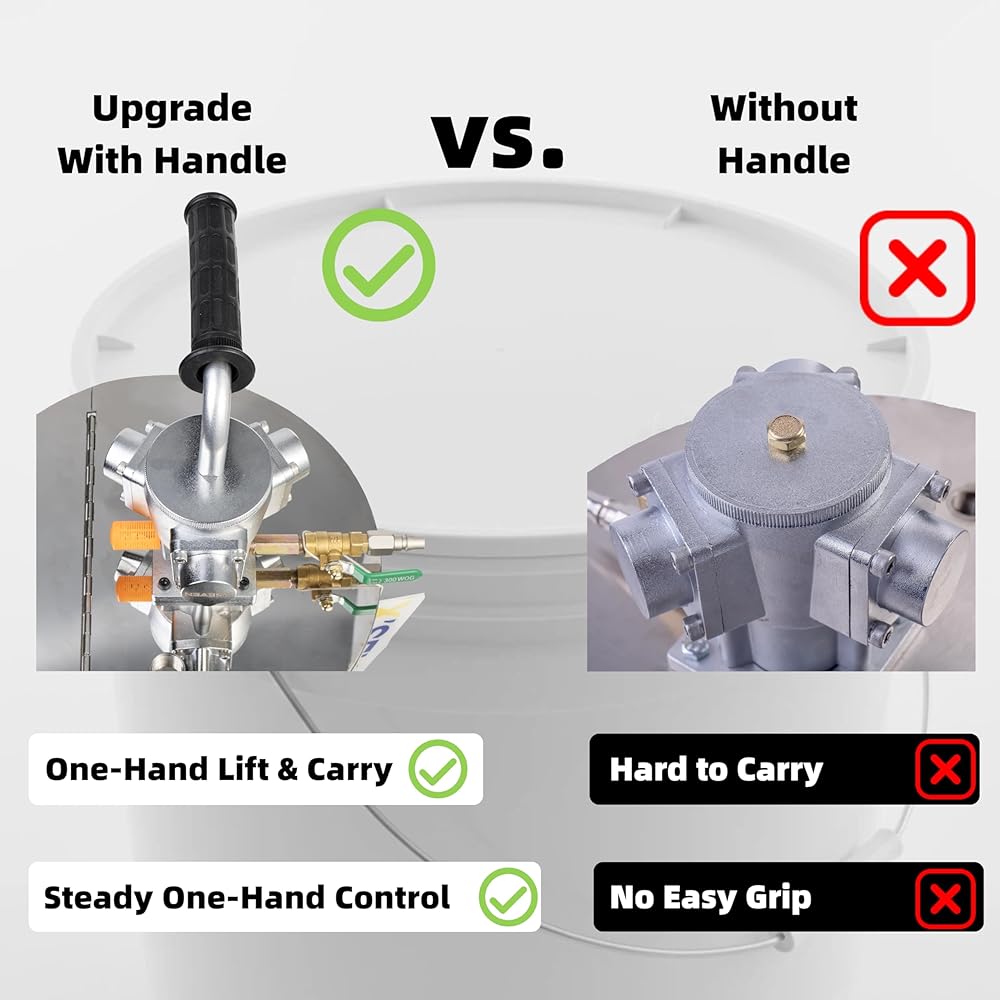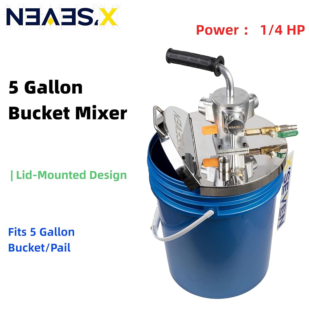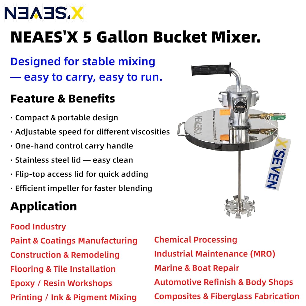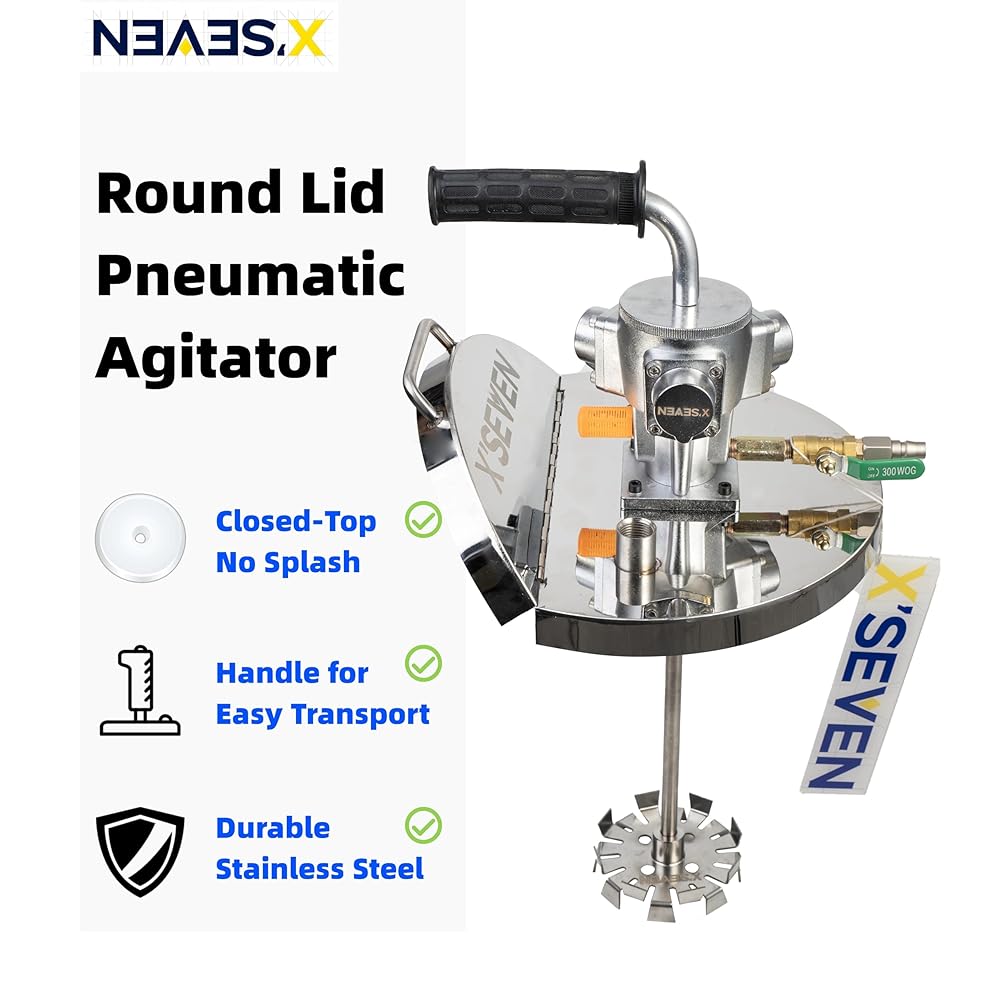 سرعة قابلة للتعديل لمواد مختلفة - يمكن تعديل سرعة الخلط وكثافته باستخدام صمام الهواء أو المنظم، من الدوران الأبطأ إلى التشتت الأقوى في دلاء سعة 5 جالون.