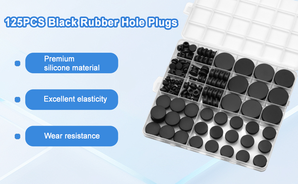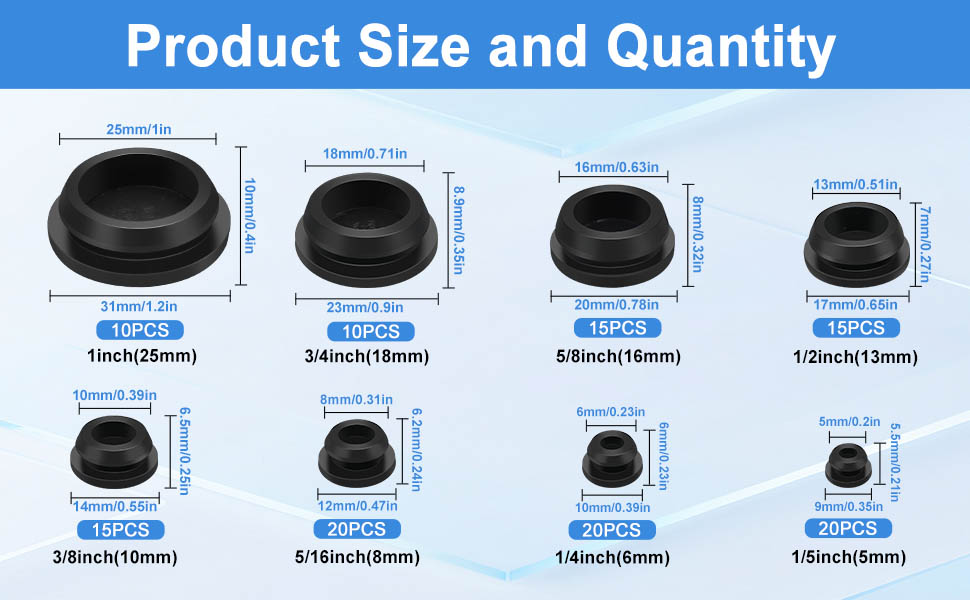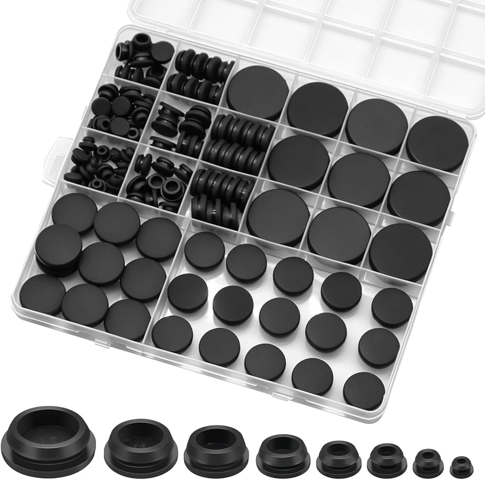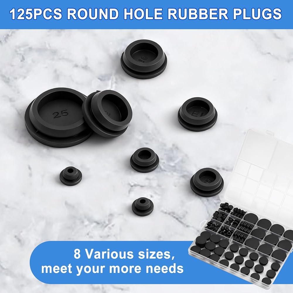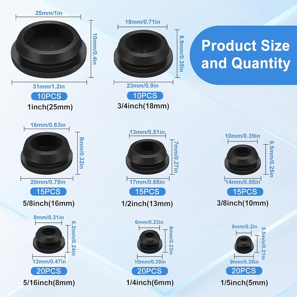 اختيار متعدد المقاسات: 125 قطعة من المقابس المطاطية ذات الفتحات المستديرة مع 8 مقاسات تشمل 1 بوصة (25 مم) 10 قطع، 3/4 بوصة (18 مم) 10 قطع، 5/8 بوصة (16 مم) 15 قطعة، 1/2 بوصة (13 مم) 15 قطعة، 3/8 بوصة (10 مم) 15 قطعة، 5/16 بوصة (8 مم) 20 قطعة، 1/4 بوصة (6 مم) 20 قطعة، 1/5 بوصة (5 مم) 20 قطعة لتلبية متطلبات الفتحة المختلفة
