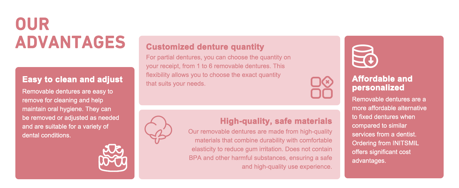 - التخصيص: أطقم أسنان جزئية مخصصة مصممة لتناسب فجوات أسنانك المحددة، مما يوفر مظهرًا طبيعيًا.