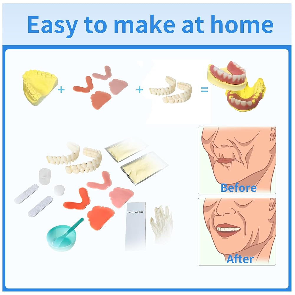 The kit contains everything you need to make your own set of dentures, as well as complete instructions to make the processas easy as possible.