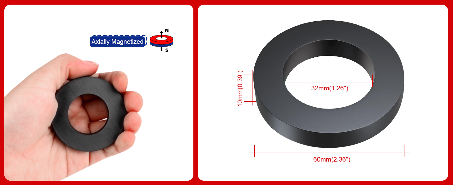 • سوف تحصل على: تحتوي كل مجموعة من المنتجات على 6 مغناطيسات حلقة فريت قوية. كل مقاس OD: 60 مم (2.36 بوصة) × المعرف: 32 مم (1.25 بوصة) × السُمك: 10 مم (0.39 بوصة). توفير الحجم المثالي لمجموعة واسعة من التطبيقات، بما في ذلك التجارب العلمية والمشروعات التعليمية