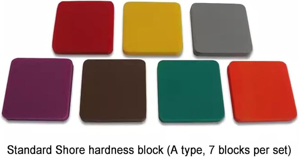 Hardness Tester A Standard Blocks: Set of 7. Dimensions: 50 x 50 x 8 mm. Color-coded to indicate hardness values. The hardness range is 30 HSA to 9 OHSA and is compatible with all Type A durometers.