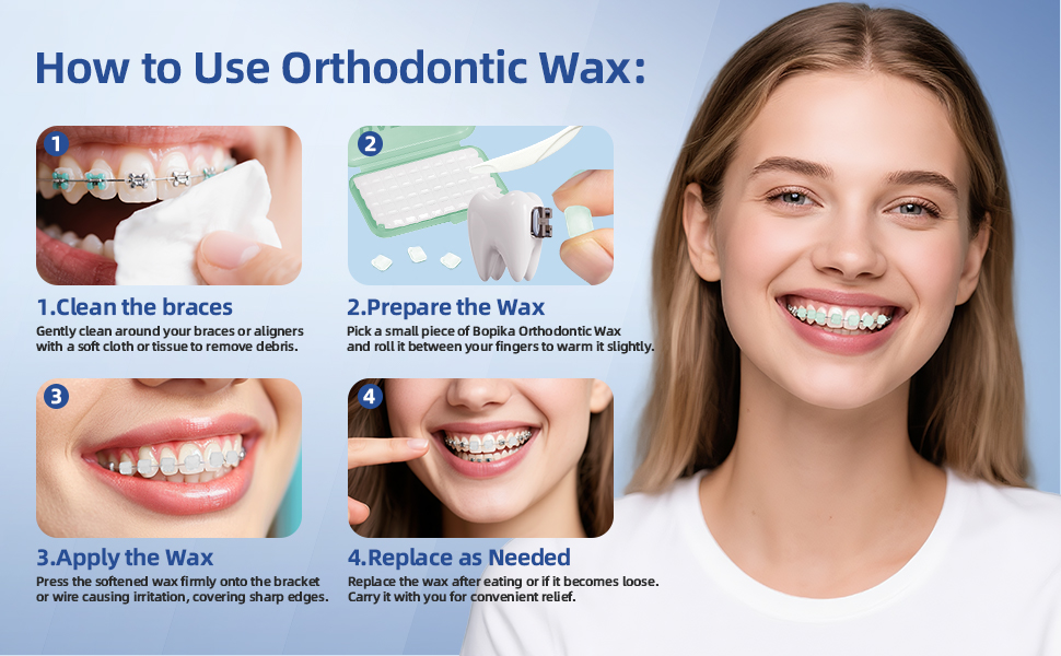 【الراحة والحماية】يخلق شمع تقويم الأسنان من RAZOKO حاجزًا ناعمًا بين تقويم الأسنان واللثة الحساسة. توفر الأقواس الشمعية للأسنان المصممة خصيصًا راحة فورية ناجمة عن الأسلاك والأقواس.