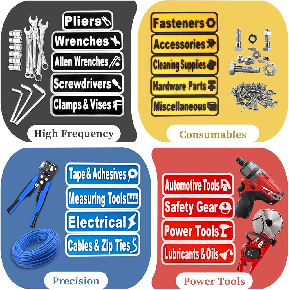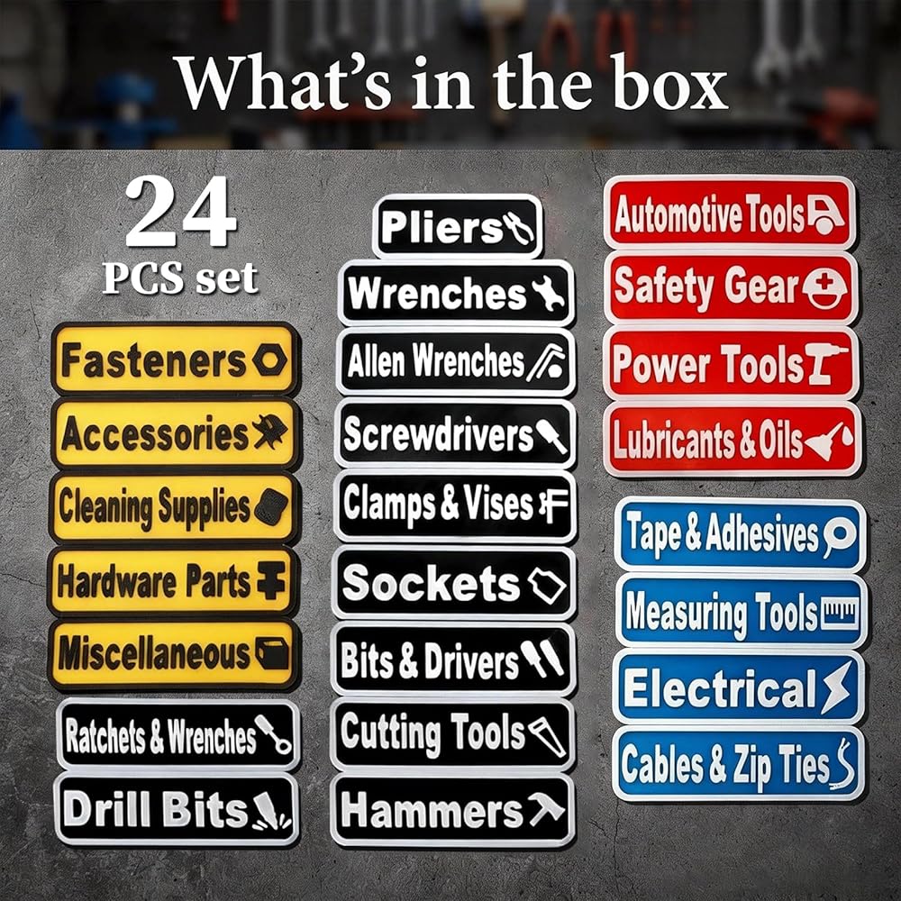 المجموعة الشاملة: يشتمل منتجنا على 24 ملصقًا مغناطيسيًا لصندوق الأدوات بأربعة ألوان (أسود وأحمر وأزرق وأصفر) لسهولة التمييز، ويغطي مجموعة واسعة من الأدوات. تُعد الملصقات المغناطيسية لصندوق الأدوات الخاصة بنا مثالية لعشاق المرآب أو الميكانيكيين أو محلات الإصلاح الاحترافية