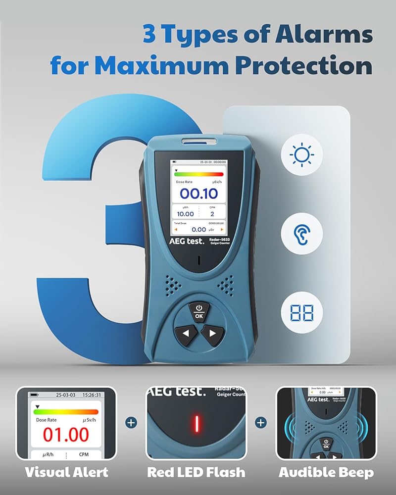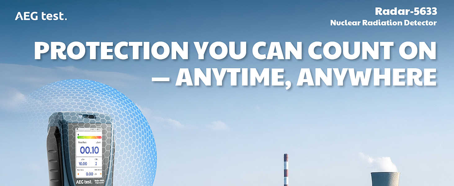 كاشف الإشعاع النووي: يستخدم كاشف الإشعاع AEGTEST Radar-5633 مستشعرات أشباه الموصلات المتطورة للكشف بسرعة ودقة عن الإشعاعات المؤينة، بما في ذلك الأشعة بيتا وغاما والأشعة السينية. يتميز بنطاق استجابة للطاقة يتراوح بين 33 كيلو إلكترون فولت إلى 3 ميجا فولت بدقة تتراوح من -17% إلى +20% (لـ ¹³⁷Cs γ). يمتد نطاق الجرعة التراكمية من 0.1 ميكروسيفرت إلى 9999 ملي سيفرت، مما يجعله مثاليًا للاستخدام المهني والحماية اليومية من الإشعاع