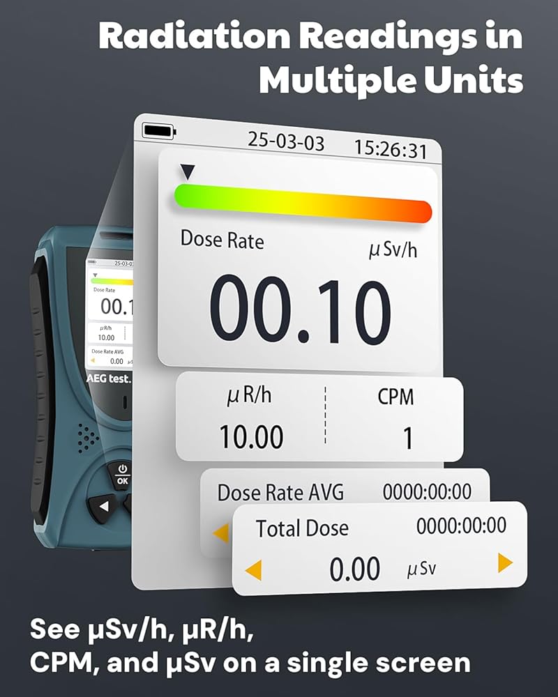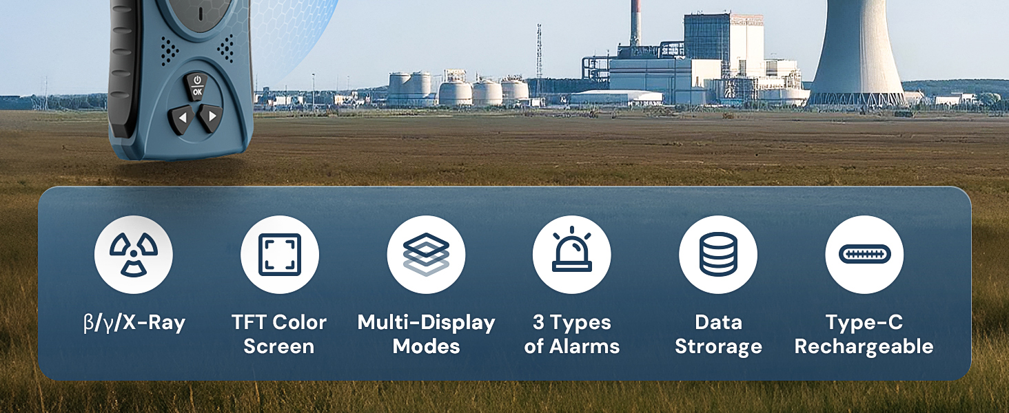 نظام إنذار مذهل: حافظ على سلامتك مع نظام إنذار قوي يتميز بتنبيهات مرئية ومسموعة وأضواء مؤشر حمراء. يمكنك ضبط حدود التنبيه المخصصة لتناسب احتياجاتك. سواء كانت الشاشة نشطة أو في وضع السكون، فسوف ينبهك الكاشف على الفور إذا تجاوزت مستويات الإشعاع عتبة التنبيه، مما يمنحك راحة البال