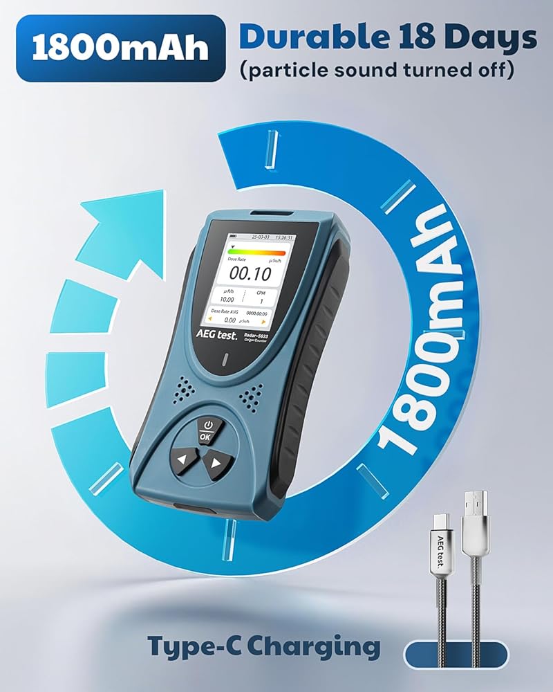 تسجيل بيانات التاريخ والبطارية القوية: مع وظيفة القياس الموقوتة، يقوم عداد جيجر تلقائيًا بتخزين البيانات التاريخية بعد كل جلسة، مما يسمح لك بتتبع مستويات الإشعاع ومراجعتها بكفاءة بمرور الوقت. بالإضافة إلى ذلك، يدعم الشحن المريح من النوع C عمر بطارية مذهل يصل إلى 18 يومًا (إيقاف صوت الجسيمات) بشحنة واحدة