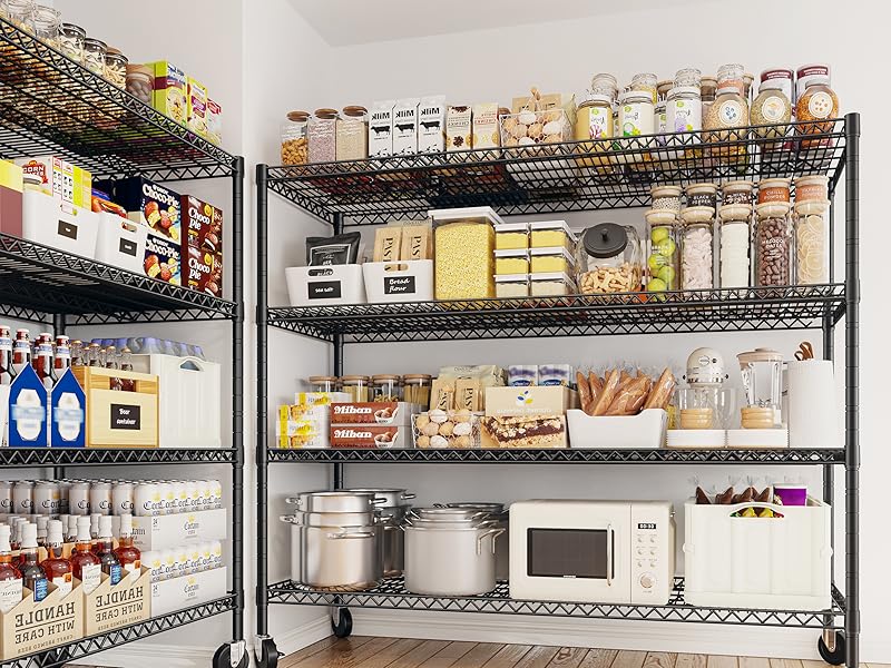 • 【أرفف تخزين دوارة بعجلات قابلة للقفل】مصممة كأرفف تخزين على العجلات، وتتضمن 4 عجلات صناعية (2 قابلة للقفل) من أجل حركة سلسة. قم بالتبديل إلى أقدام تسوية قابلة للتعديل لمزيد من الثبات على الأرضيات غير المستوية أو عند تخزين العناصر الأثقل.