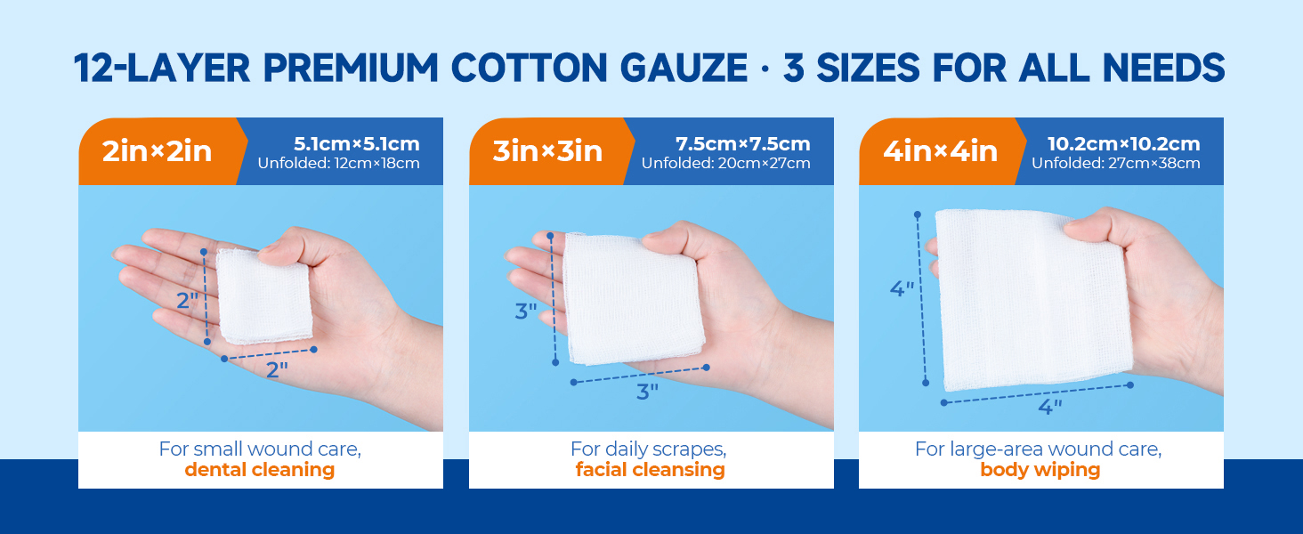 هيكل متين مكون من 12 طبقة: يتم طي كل وسادة بعناية إلى 12 طبقة باستخدام خيوط السداة واللحمة ذات العدد العالي 19 × 15. يقلل هذا الهيكل الكثيف من الاهتراء والتكديس وتساقط الألياف، بينما يمنع أيضًا التصاق الشاش بالجروح أثناء الاستخدام.
