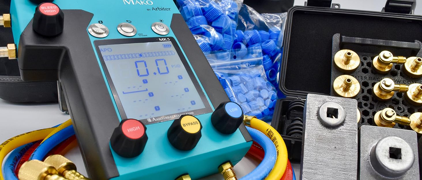 Mako Master Pack bundle includes the MK5 test kit, YOUR CHOICE of aluminum or brass quick test fitting set in a NEW *PATENT PENDING* Holder + O-rings inside a hard case, BV101 bleed/ compensation valve, MKSH1 Mako Sight Hose Kit with Grip Clip, MKYF1 "Y"-fitting (MK5 only), WV100 small valve, WV106 wide handle & WV101 large valve over the handle ball valve wrenches, WV105 heavy-duty universal missing handle wrench, SHP1 1/4" plastic plugs, SHP8 1/2" plastic plugs, SHP12 3/4" plastic plugs, G2 plastic caps, reversible screwdriver and the MKSC20 case.