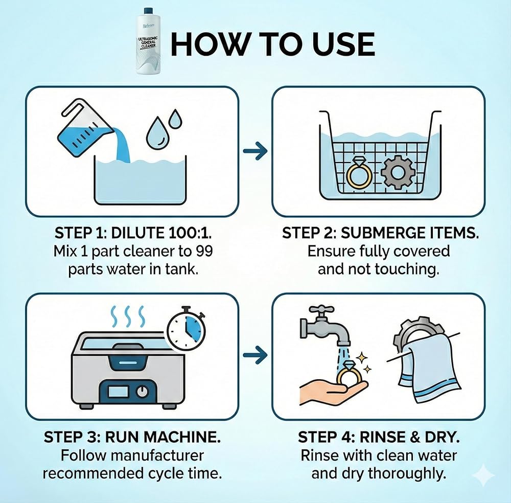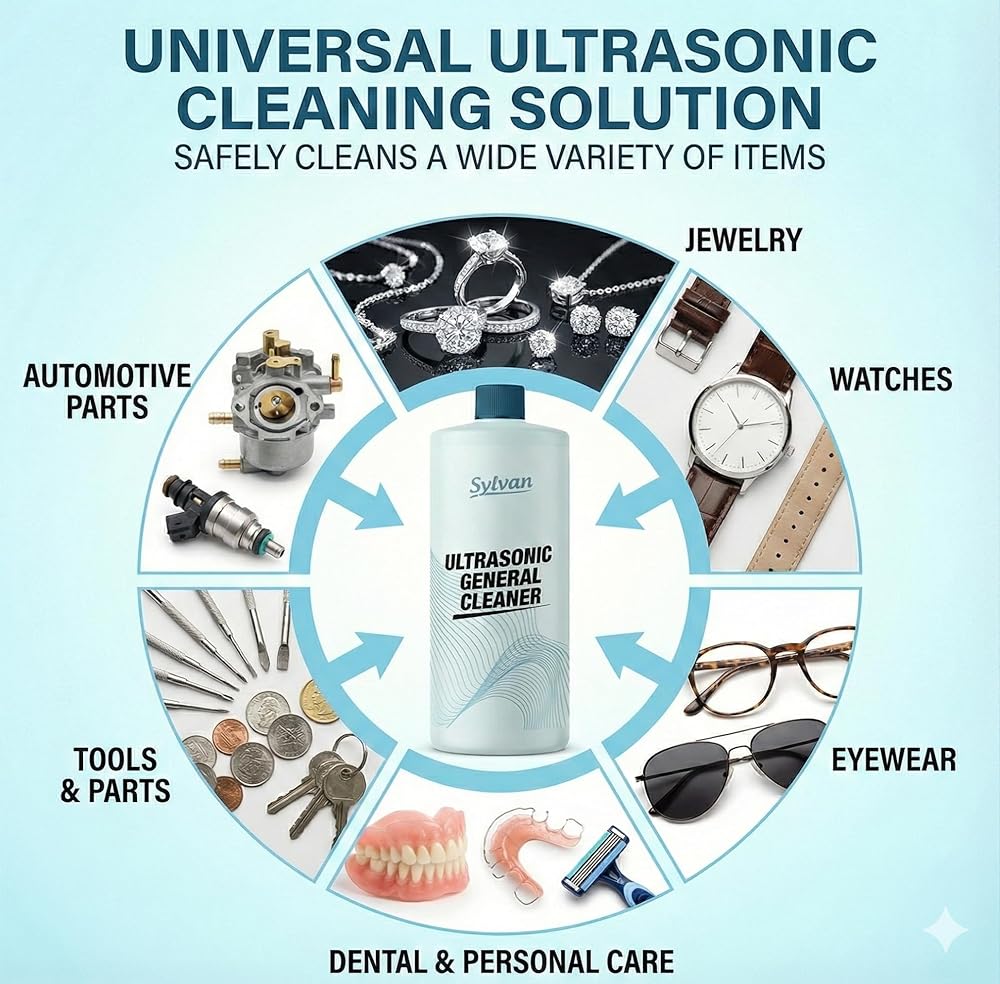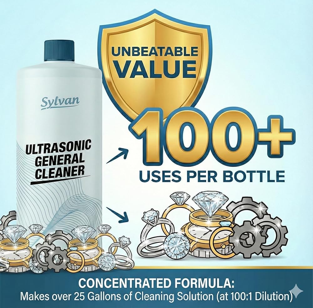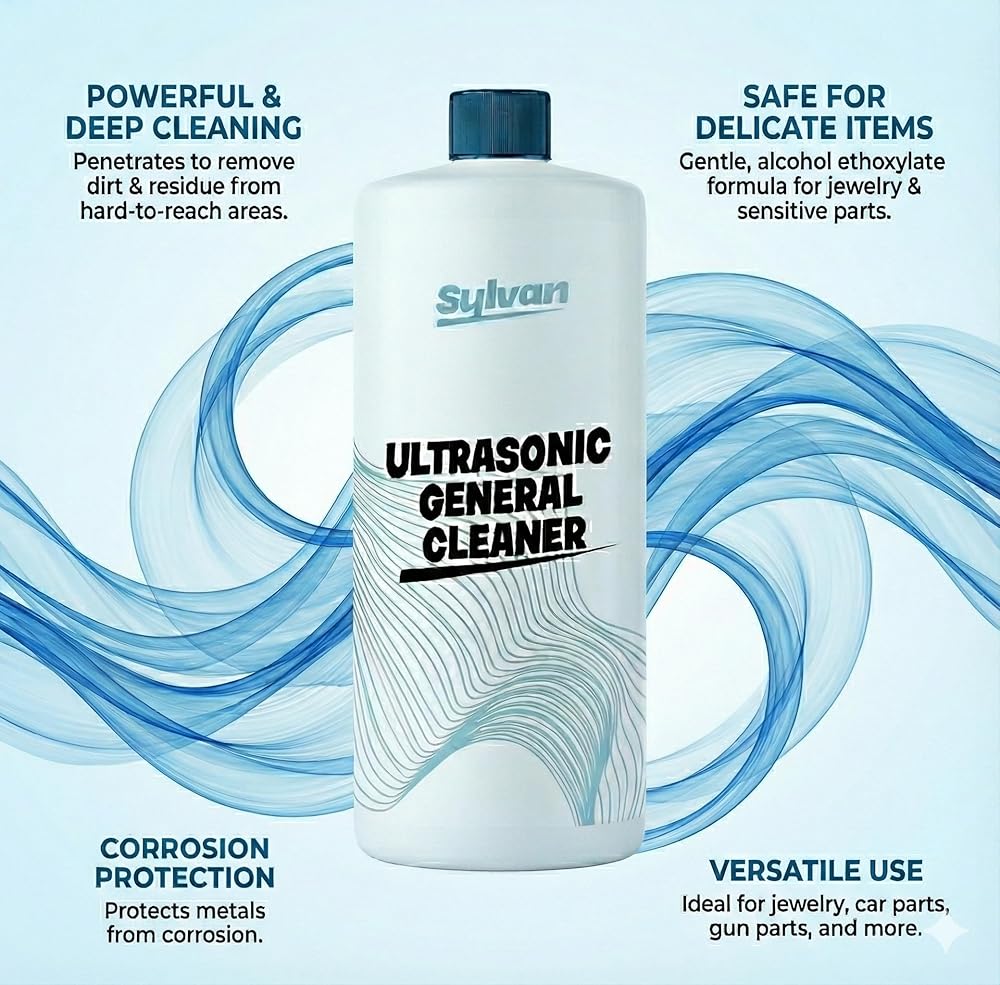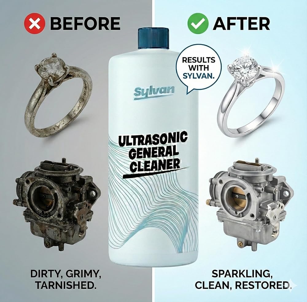 Restore your carburetors and metal parts to their best condition with Sylvan Hills Ultrasonic Carburetor & Parts Cleaner Solution. This high-performance concentrate is engineered for use in all ultrasonic and immersion machines, delivering a deep, effective clean for carburetors, engine components, and small parts with minimal effort. Our 32 oz bottle makes up to 50 gallons of ultrasonic cleaner solution, giving you outstanding value. Simply dilute at a 1:250 ratio with water in your ultrasonic cleaner. If buildup persists, increase concentration. The ultrasonic cleaning action reaches deep into crevices that brushes or sprays can't access—perfect for hobby mechanics, engine restorers, and DIY enthusiasts. Use this ultrasonic cleaner solution to remove residue from aluminum, brass, copper, steel, and other durable metals. Ideal for carbs, jets, valves, fuel injectors, bolts, and more. After cleaning, rinse with clean water and dry thoroughly using the included microfiber cloth. This ultrasonic carb cleaner solution is compatible with any ultrasonic parts cleaner—home or professional. Replace your cleaning bath regularly or when visibly dirty for best results. It's an essential tool for maintaining parts with precision, without relying on harsh aerosols or scrubbing. Proudly made in the USA, this ultrasonic solution for carburetors and engine parts is formulated without harsh fumes or corrosive chemicals. Whether you're cleaning motorcycle parts, gun components, or engine hardware, Sylvan Hills ultrasonic cleaner liquid delivers results you can trust—every time.