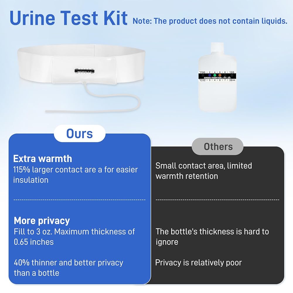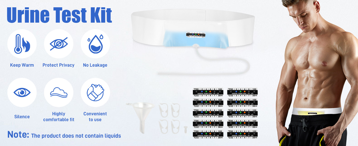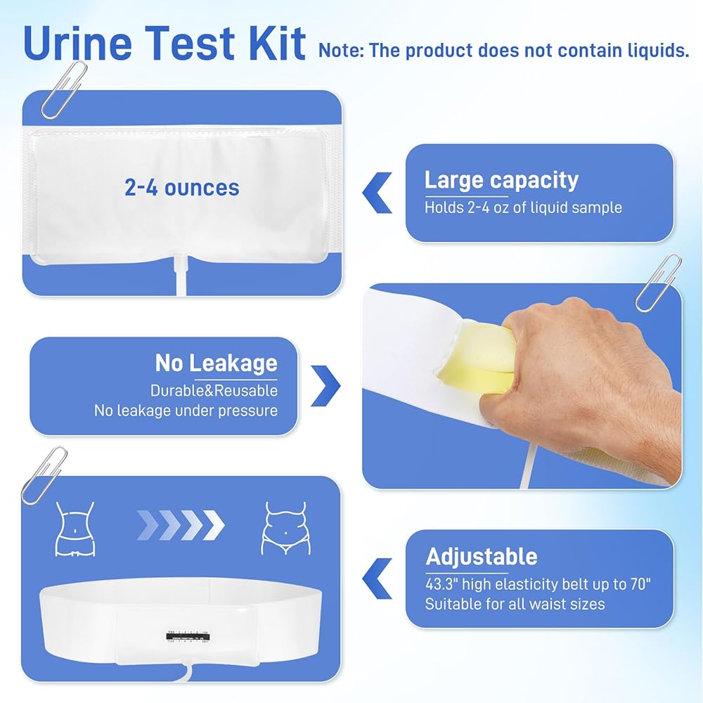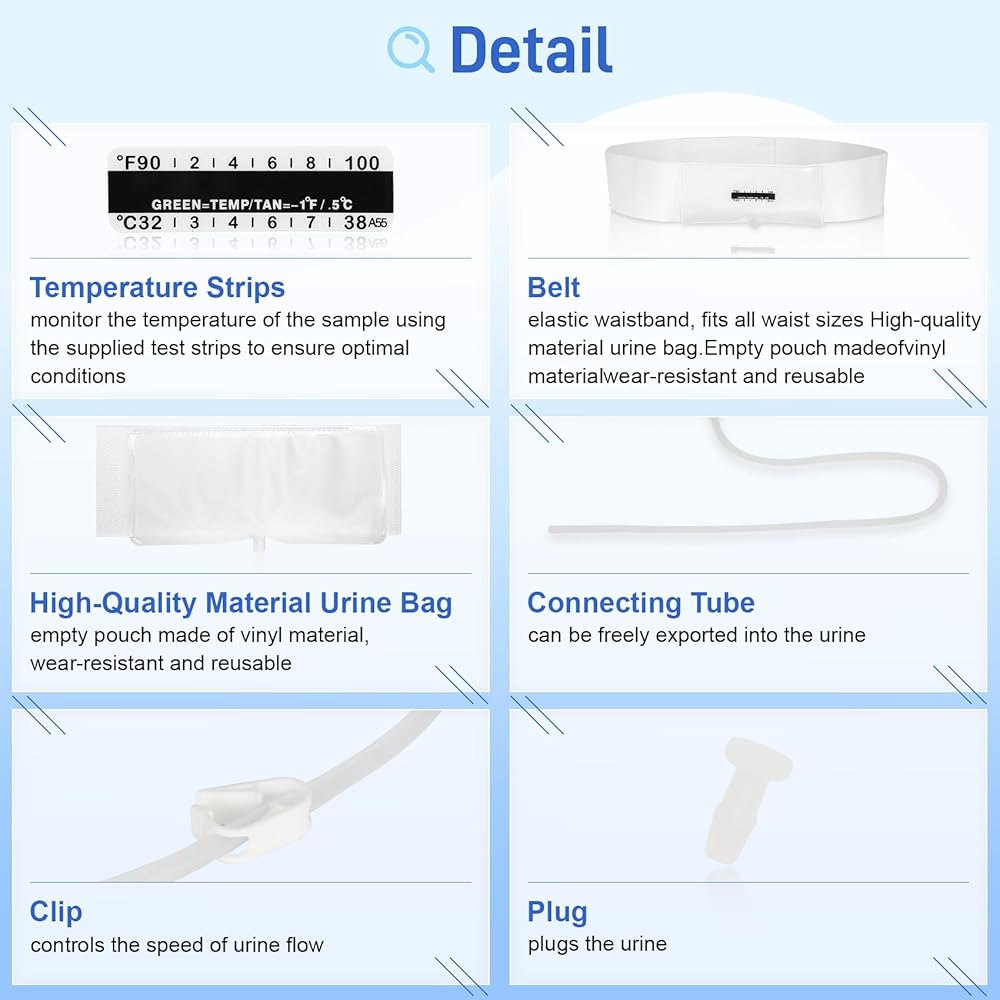 حزام بول مطور مع حقيبة عينات مخفية بوزن 2-4 أونصة، يتضمن 10 شرائط لدرجة الحرارة وقمع واحد، ونظام تخزين قابل لإعادة الاستخدام للمستشفيات والطوارئ والسفر