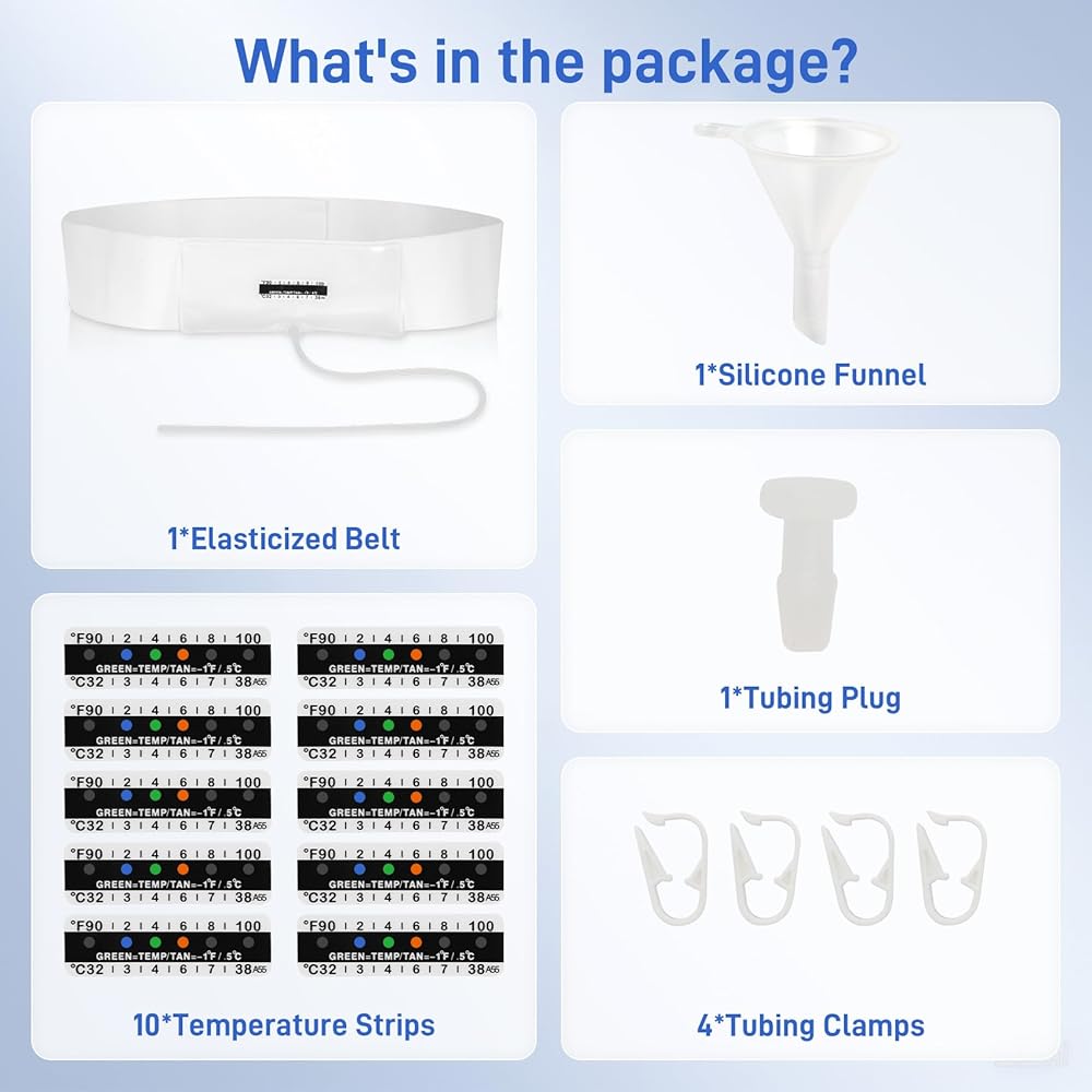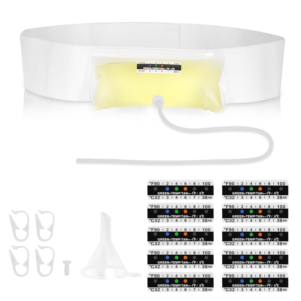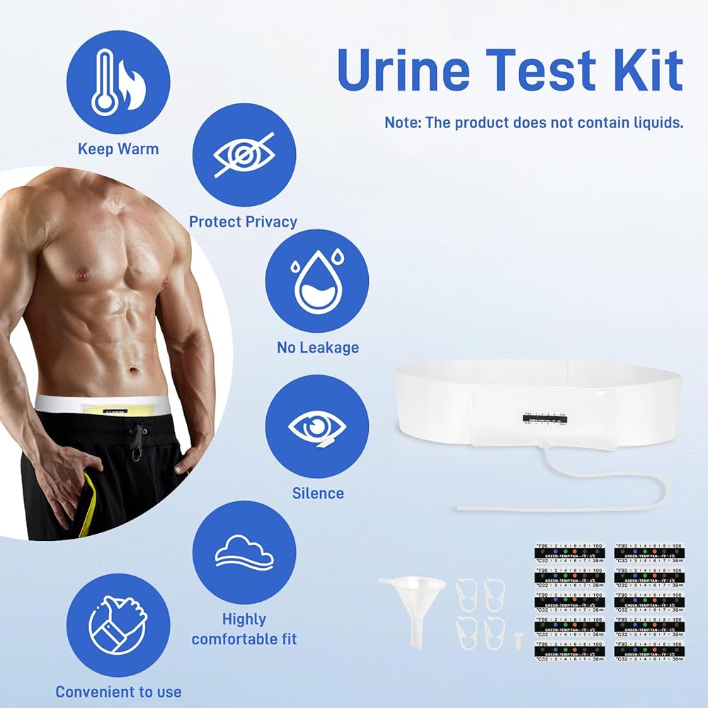 حزام بول مطور مع حقيبة عينات مخفية بوزن 2-4 أونصة، يتضمن 10 شرائط لدرجة الحرارة وقمع واحد، ونظام تخزين قابل لإعادة الاستخدام للمستشفيات والطوارئ والسفر