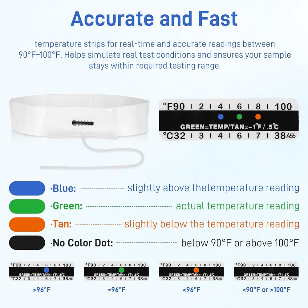 مراقبة دقيقة لدرجة الحرارة: تشتمل مجموعة اختبار البول على 10 أشرطة لدرجة الحرارة للحصول على قراءات دقيقة في الوقت الحقيقي تتراوح بين 90 درجة فهرنهايت إلى 100 درجة فهرنهايت، مما يساعد على تكرار ظروف الاختبار الأصلية.