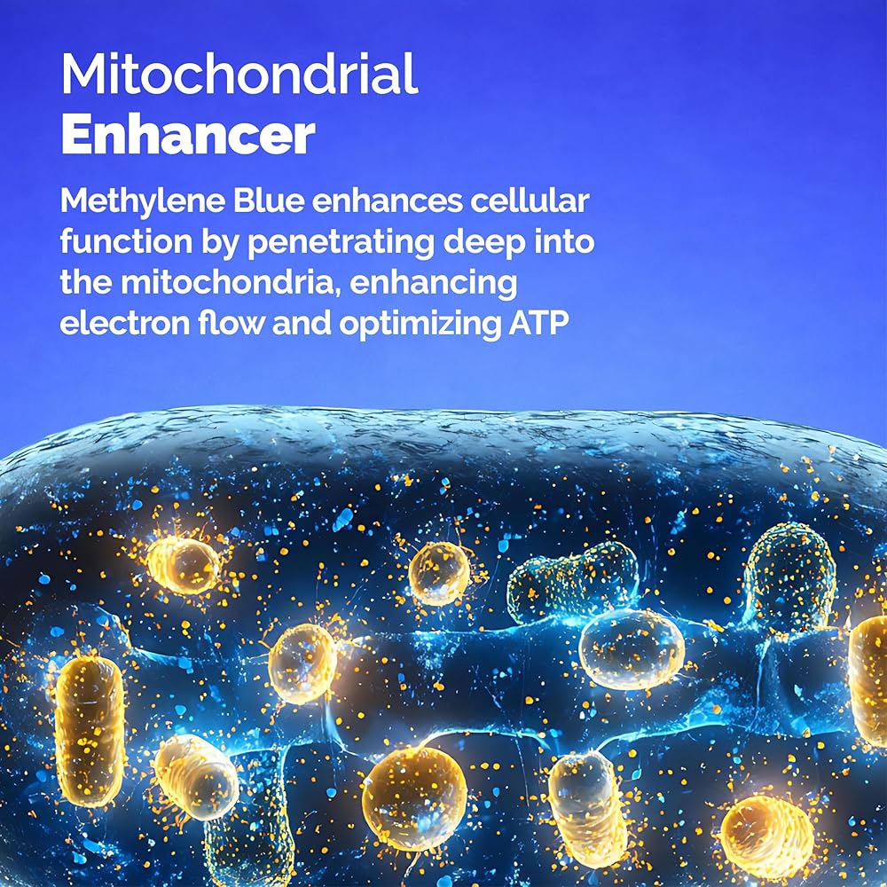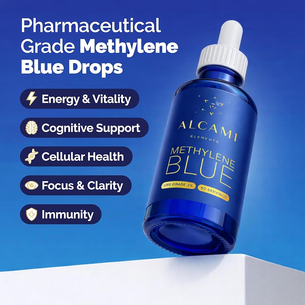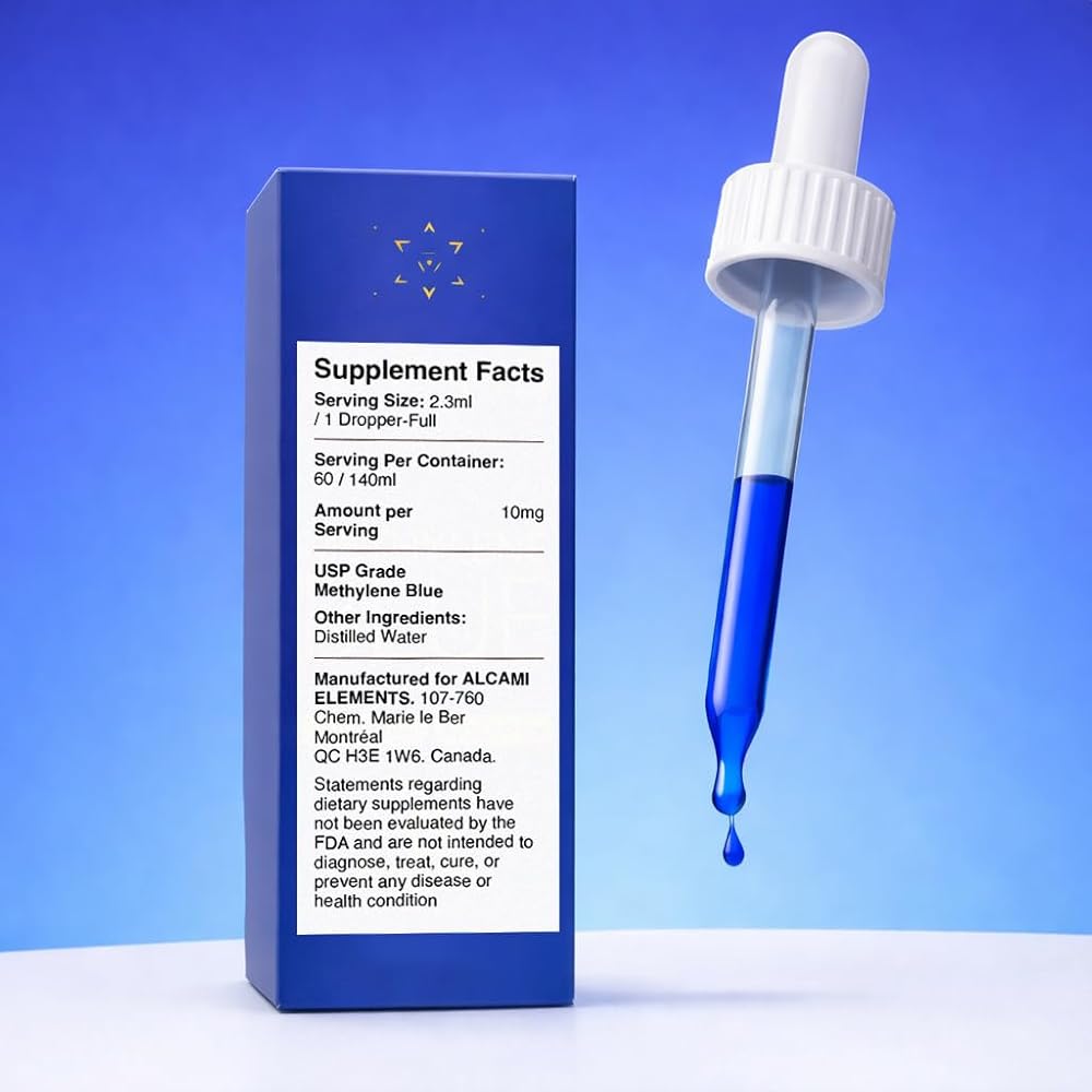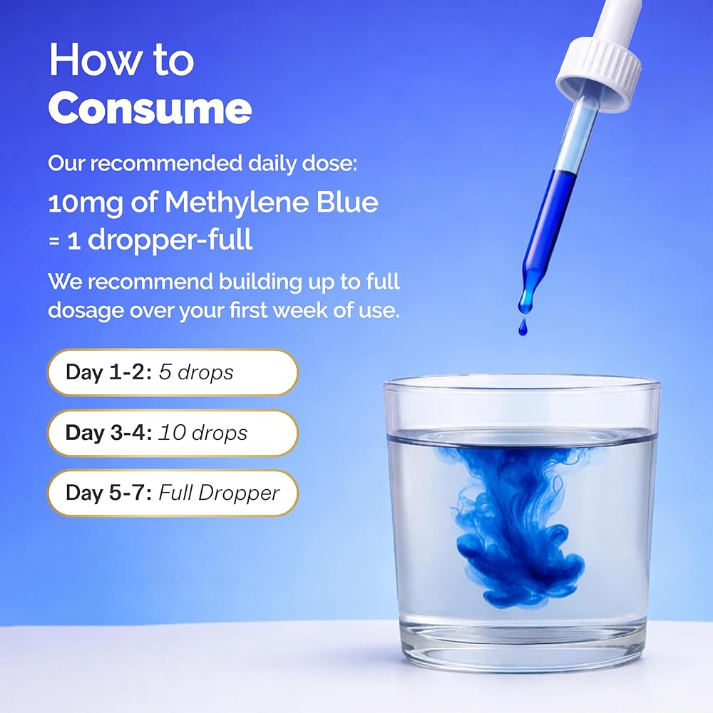 أزرق الميثيلين 99.9% جودة دوائية نقية - يدعم الطاقة والتركيز والوظيفة الإدراكية - تم اختباره بواسطة طرف ثالث، خالي من الفورمالديهايد والمعادن - 1% قطرات بدرجة دستور الأدوية الأمريكي - 60 وجبة