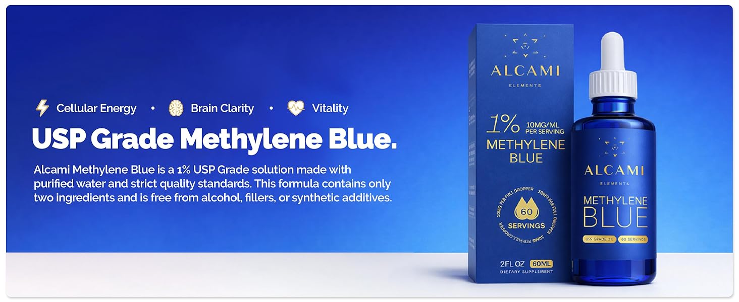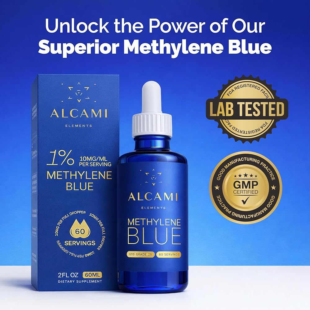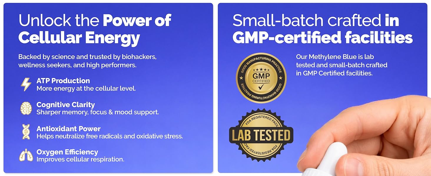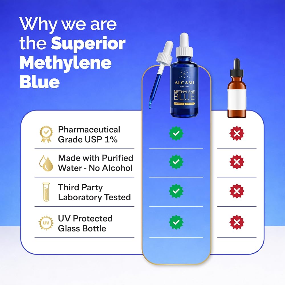 أزرق الميثيلين 99.9% جودة دوائية نقية - يدعم الطاقة والتركيز والوظيفة الإدراكية - تم اختباره بواسطة طرف ثالث، خالي من الفورمالديهايد والمعادن - 1% قطرات بدرجة دستور الأدوية الأمريكي - 60 وجبة