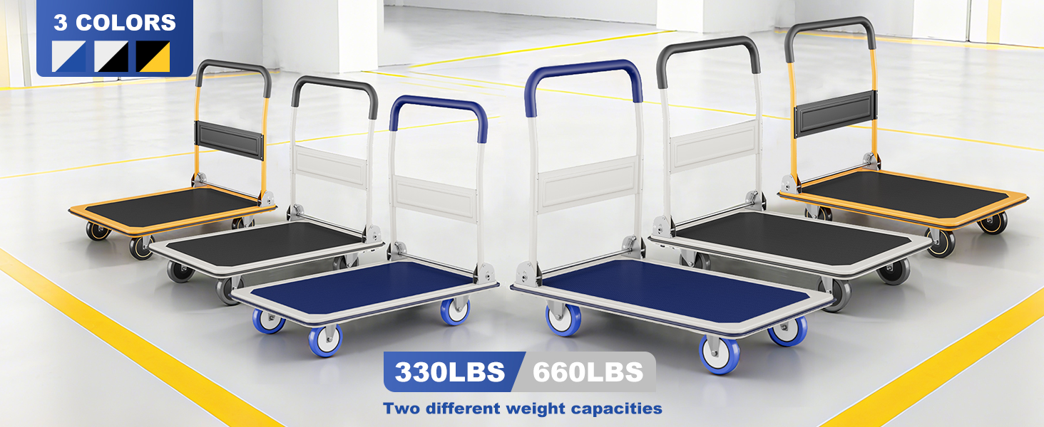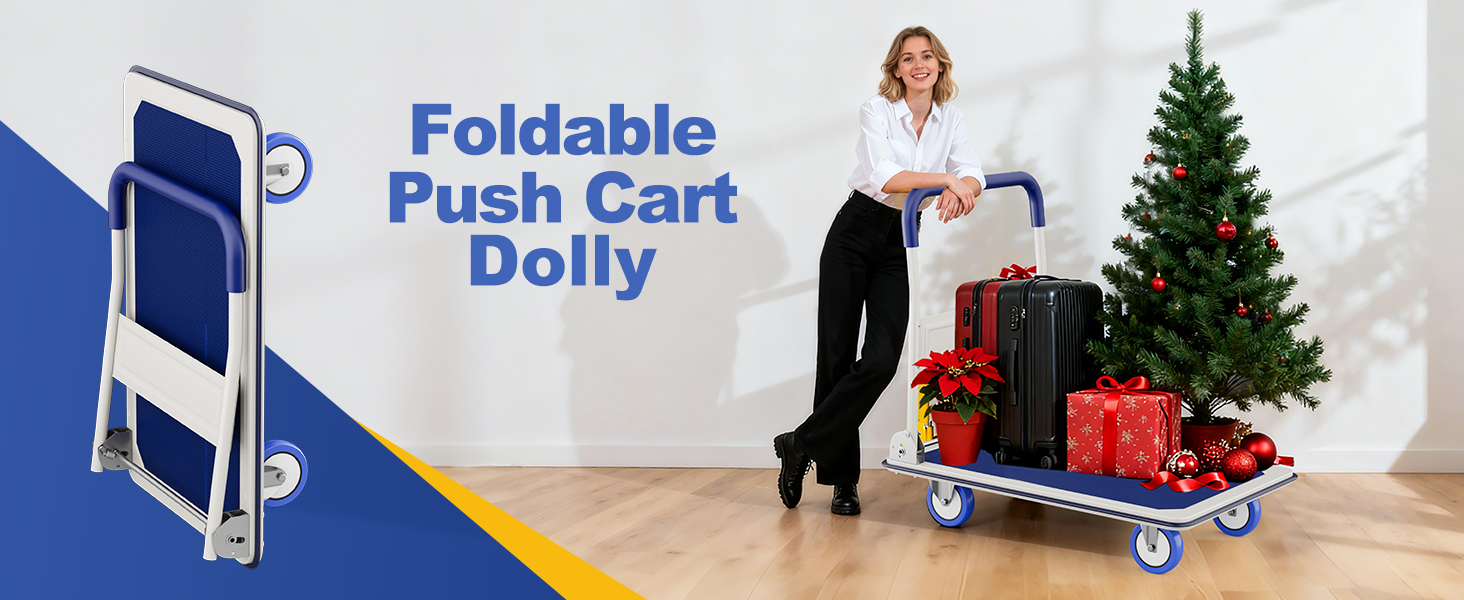 【مقبض قابل للطي للتخزين المريح】ينطوي المقبض بشكل مسطح في 3 ثوانٍ فقط، مما يقلل ارتفاع عربة المنصة إلى 9-1/2 بوصة فقط عند طيها من أجل تخزين سريع وموفر للمساحة في الخزانات أو المرآب أو صناديق السيارة.