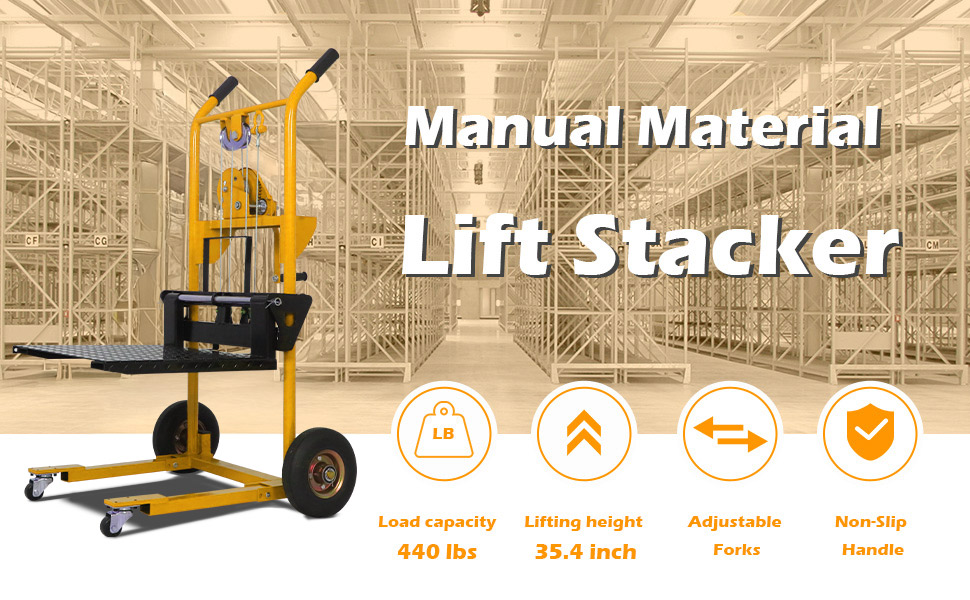 رفع قوي: تتميز مكدس البليت هذا بقدرة تحميل تبلغ 440 رطلاً وارتفاع رفع يبلغ 35.4 بوصة، مما يسهل استيعاب المواد المختلفة. بفضل عرض الشوكة القابل للتعديل من 5.8 إلى 20.3 بوصة، يمكنها التكيف مع أحجام الحمولة المختلفة، مما يعزز التنوع والكفاءة لمجموعة واسعة من مهام الرفع