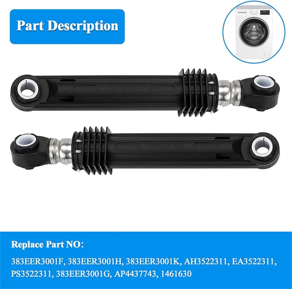 Description Report Item [WASHER SHOCK ABSORBER KIT ]:DAMPER ASSY part no. 383EER3001G ,This is a new For LG replacement part. Replace Part NO # 383EER3001J ,4901ER2003A,383EER3001F, 383EER3001H,1461630,383EER3001K,AH3522311,EA3522311,PS3522311,AP4437743,AP4437743,PS3522311,1335104,AP5226074,PS3583320,EAP3583320. [ EXCELLENT PERFORMANCE]Washing Machine Shock Absorber Kit. Includes (3) shock absorber and (6) mounting pins.Shock absorbers play an important role in washing machines:they affect noise production during operation, help buffer and balance the drum, and prevent shaking even at high speeds.If your washer is running erratically, is running noisy or is running shaky, shock absorber replacement could solve your washer's problem. [EASY DIY FIX]Easy Install and cost-effective.You can easily find the installation method on online video.Plug and play. It does not require modification or adapter neededBy following the install process replace the broken sensor easily. Please be aware that all utilities should be disconnected from your Washing Machine Appliance prior to replacing the Damper Assembly.Take a clear picture of around the part your are willing to replace for easier replacing.
