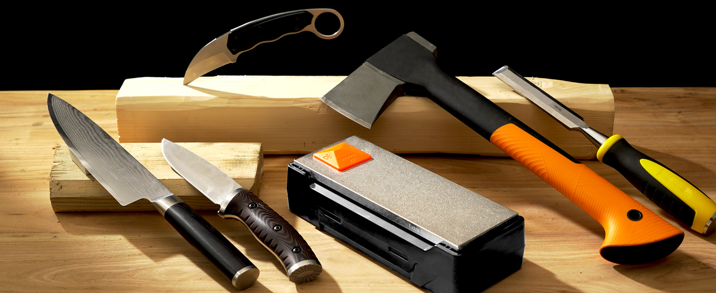 حزمة إضافية فائقة: تتضمن صندوق تخزين مع وسادة مطاطية غير قابلة للانزلاق يمكن استخدامها كقاعدة حجرية أثناء الشحذ؛ مع دليل زاوية الشحذ المدمج مع 4 زوايا عالمية - 14 درجة، 17 درجة، 20 درجة، 25 درجة ودليل تعليمات داخل العبوة.