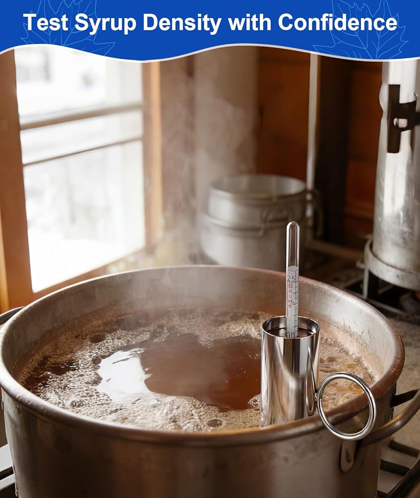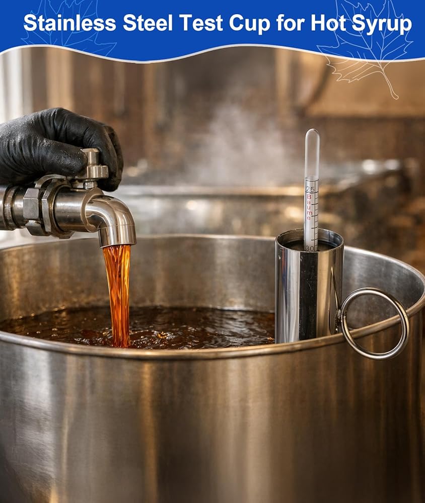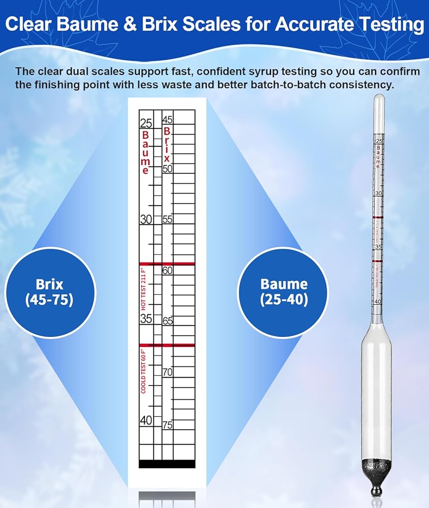 【قياس بسيط للكثافة】اجمع عينة ساخنة، ثم ضع مقياس كثافة الماء القيقب في الكوب، واقرأ قيمة بوم أو بريكس على خط الشراب، ثم أنهي الغليان للوصول إلى الكثافة المستهدفة. توفر القراءات الواضحة والتنظيف السهل الوقت، وتقلل من النفايات، وتحسن الاتساق من دفعة إلى أخرى.