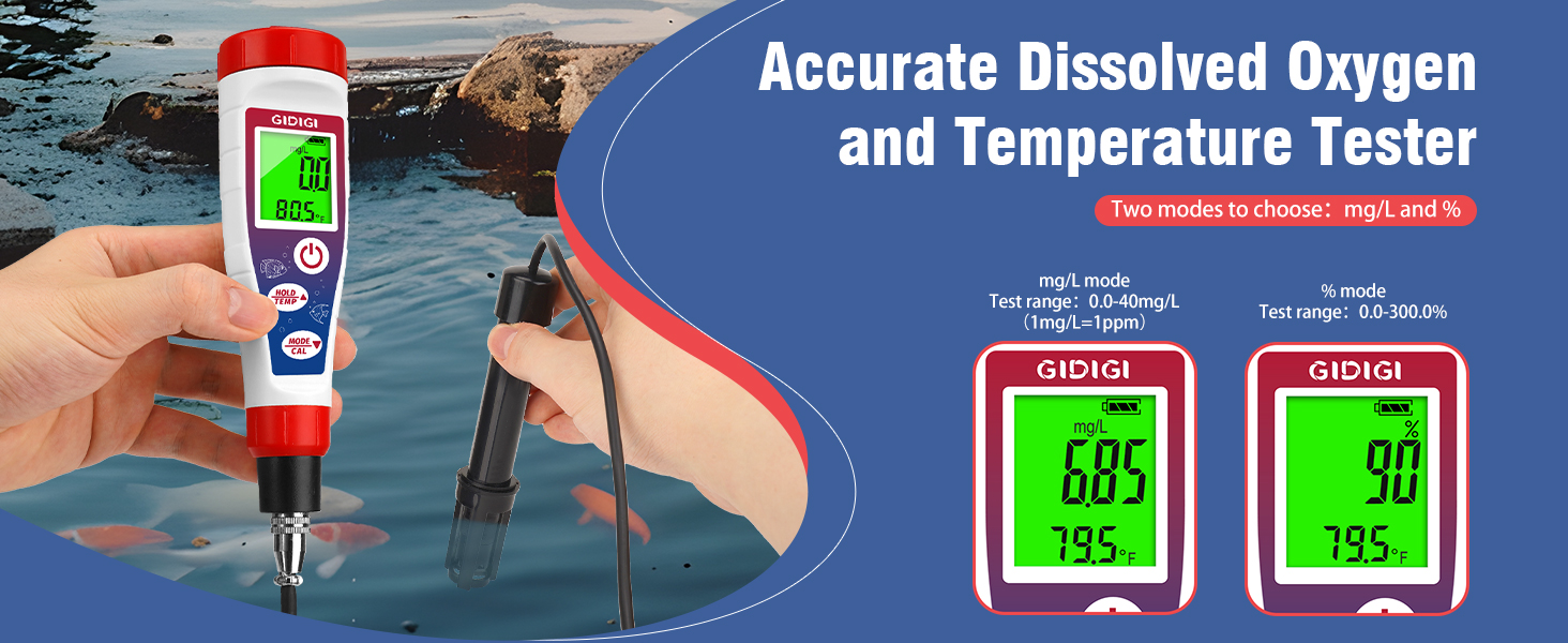 DO متر مع وسائط mg/L و٪: مجموعة اختبار الأكسجين المذاب مع وضعين: وضع mg/L (محتوى الأكسجين المذاب في الماء، 1mg/L = 1ppm) ووضع٪ (نسبة التشبع). يوفر مقياس DO نطاقًا واسعًا لقياس الأكسجين المذاب (0.0-40 ملجم/لتر)، وتشبع الأكسجين المذاب (0.0-300.0%)، ودرجة الحرارة (0.1-40.0 درجة مئوية؛ 32.0-104.0 درجة فهرنهايت).