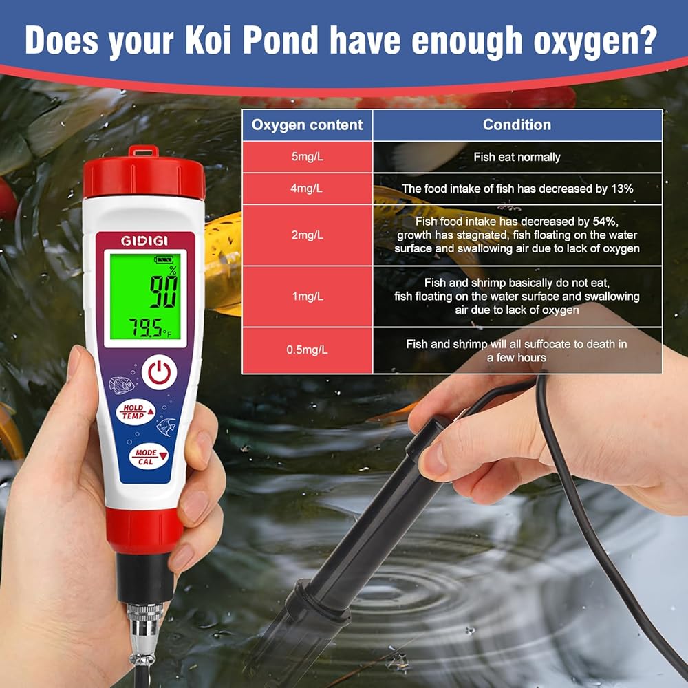 مجموعة اختبار مياه البركة مع شاشة LCD: مقياس الأكسجين المذاب GIDIGI مع شاشة LCD بإضاءة خلفية رقمية، والتي يمكنها بسهولة الحصول على قراءات في البيئات الخافتة، ولها وظيفة قفل البيانات ووظيفة تبديل درجة الحرارة (درجة فهرنهايت/درجة مئوية).