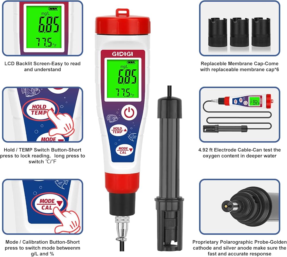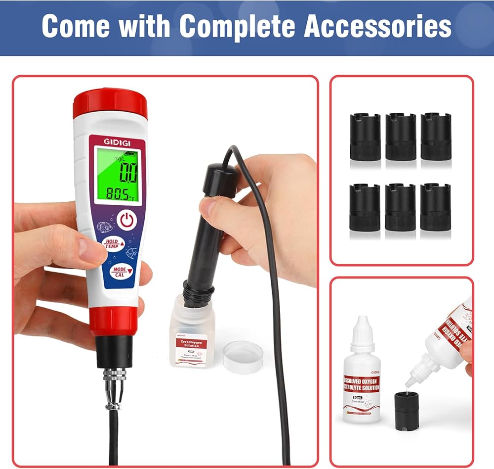 سهل الاستخدام والمعايرة: يأتي جهاز اختبار الأكسجين المذاب من GIDIGI مع تعليمات مفصلة وملحقات كاملة (غطاء غشاء قابل للاستبدال*6، إلكتروليت*2 وماء أكسجين صفر*1). لا حاجة لشراء محلول المعايرة، يمكنك معايرة جهاز الاختبار بسهولة. عملية بسيطة، ما عليك سوى وضع القطب الكهربائي للاختبار في محلول الاختبار للحصول على قيمة اختبار الأكسجين الدقيقة بسرعة. ويمكنك بسهولة الحصول على غطاء الغشاء ومحلول المعايرة من خلال تصفح متجر GIDIGI.