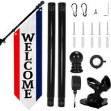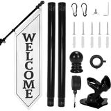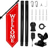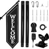 مجموعة علم الترحيب مزدوجة الجوانب شديدة التحمل - لافتة قماش خارجية مقاس 42 × 13 بوصة مع عمود ودعامة معدنية - لافتة واجهة متجر الأعمال لعرض البيع بالتجزئة أو المتجر أو المطعم (أسود)