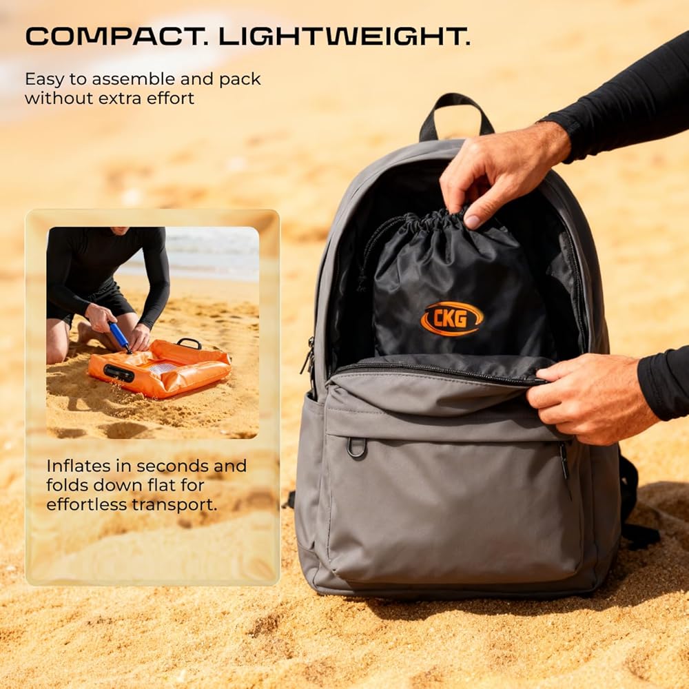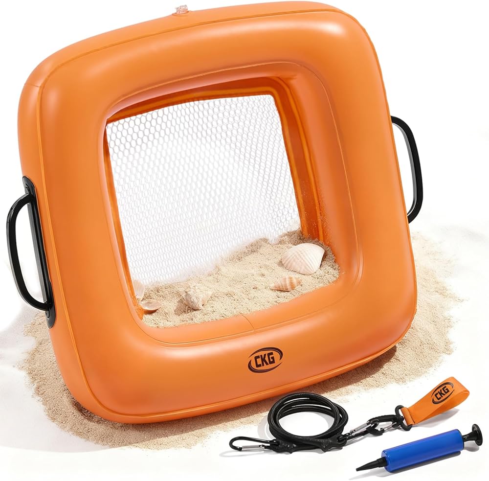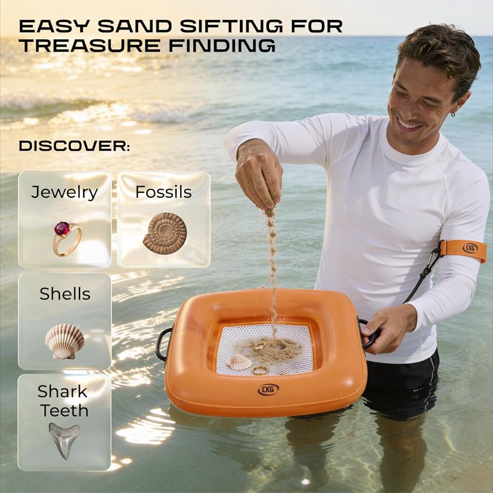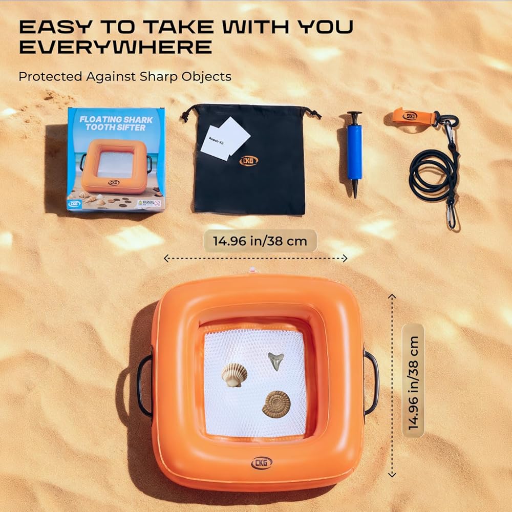 Meet the CKG Floating Inflatable Sand Sifter, a packable soil sifter designed for ocean days and riverbanks. The floating sifter stays on the surface so it's easy to grab, and the comfy grip helps you shake sand fast like a true sand remover for beach cleanup. Bring it with your beach supplies as one of your beach accessories must haves and beach essentials for family trips. Use it instead of a bulky beach shovel for quick sorting, or pair it with gold panning gear when you want to screen material efficiently. Double mesh delivers clean separation for a sand sifter for shark teeth and a sifter for fossils, so it works as a fossil sifter for shells, fossils, coins, and jewelry. It's a shark teeth sifter for beach adventures, a reliable shark teeth sifter, and a floating sifter for shark teeth that helps every shark tooth finder spot tiny treasures. Made for grown-ups too, it's a beach sand sifter for adults, a shark tooth sifter for adults, and one of the most useful sand sifters for beach hunting, including sand sifter for the beach shark teeth seekers and sand shifters beach explorers. Pack it as beach accessories for vacation and beach items for vacation planning, add it to beach trip must haves, and count it among beach must haves 2026 and vacation essentials for kids. Turn sorting into beach games for family and keep sand off your gear with this sand remover and versatile floating sifter.