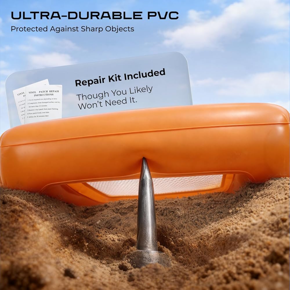 Durable Body: Tough inflatable PVC with reinforced seams and strengthened rim resists punctures and saltwater wear, while soft side grips keep control this beach sand sifter is built for seasons of use.