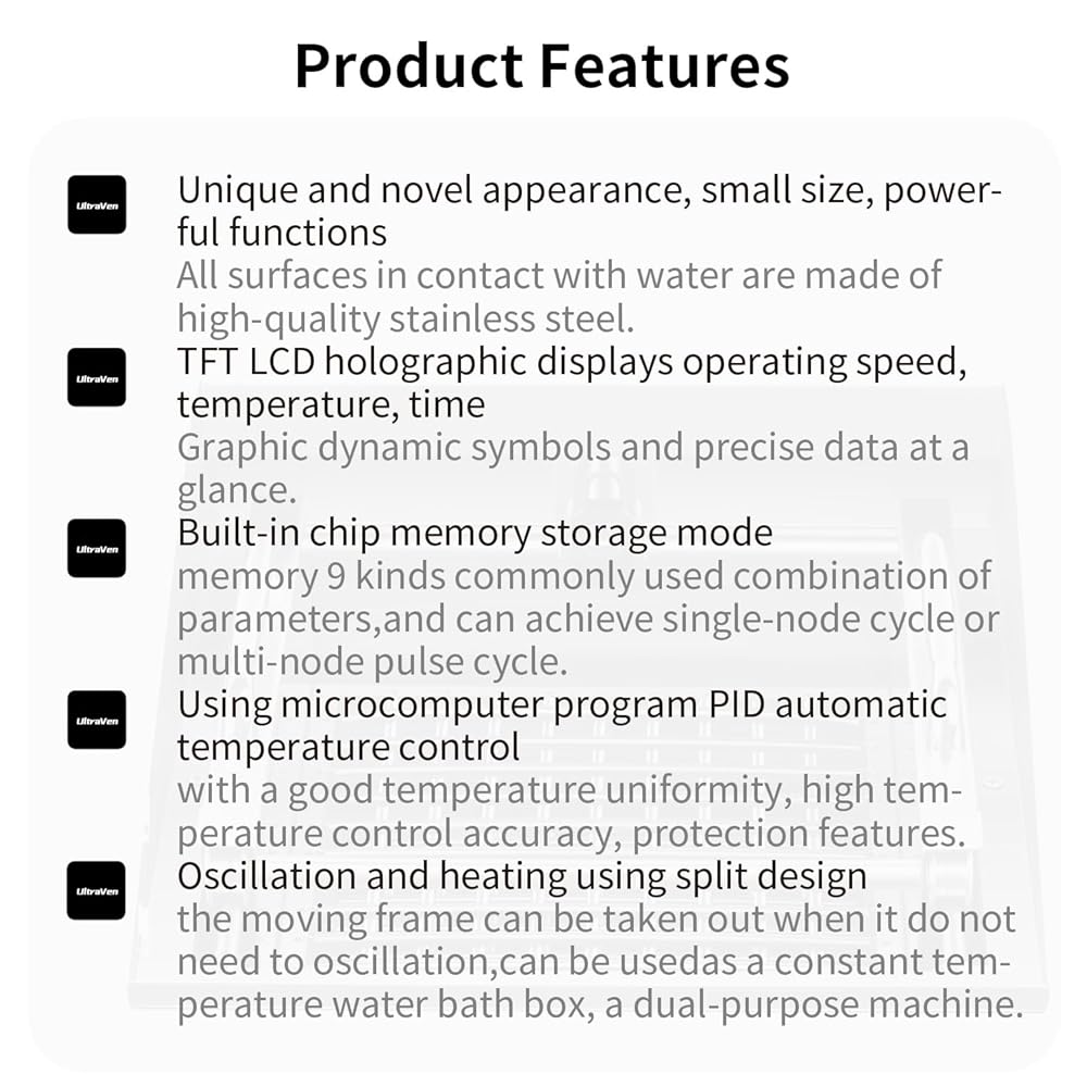 التذبذب والتسخين باستخدام تصميم منفصل، يمكن إخراج الإطار المتحرك عندما لا يحتاج إلى التذبذب، ويمكن استخدامه كصندوق حمام مائي بدرجة حرارة ثابتة، وهي آلة مزدوجة الغرض.