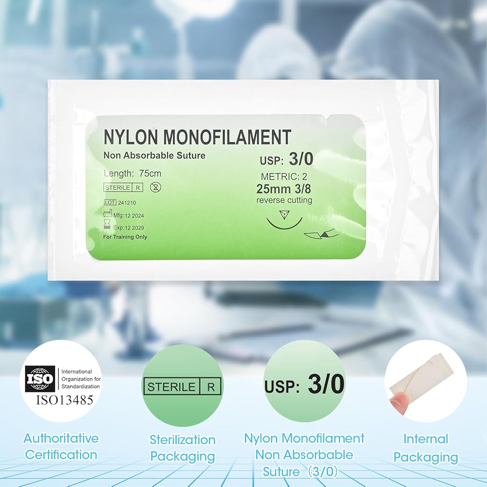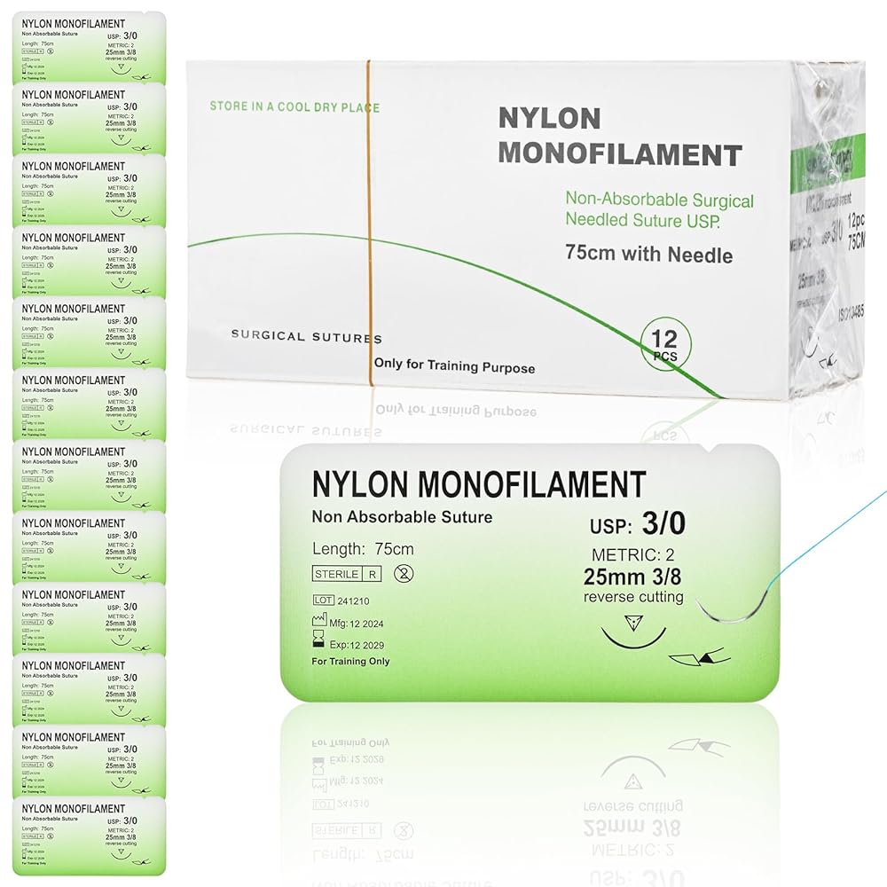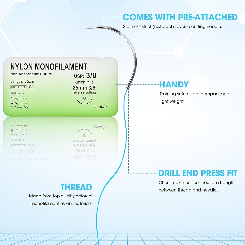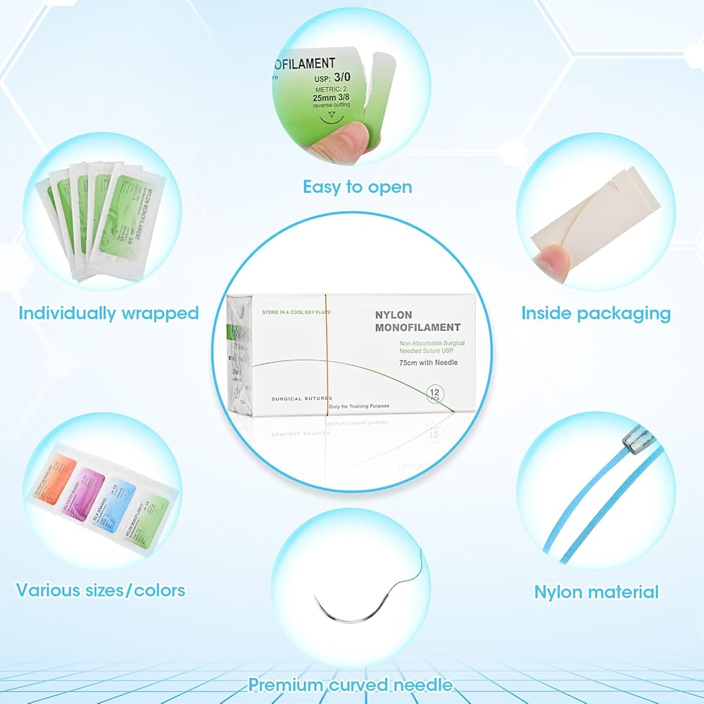 تشتمل على: مجموعة تدريب الخياطة 3/0، خيط نايلون أحادي، 12 قطعة