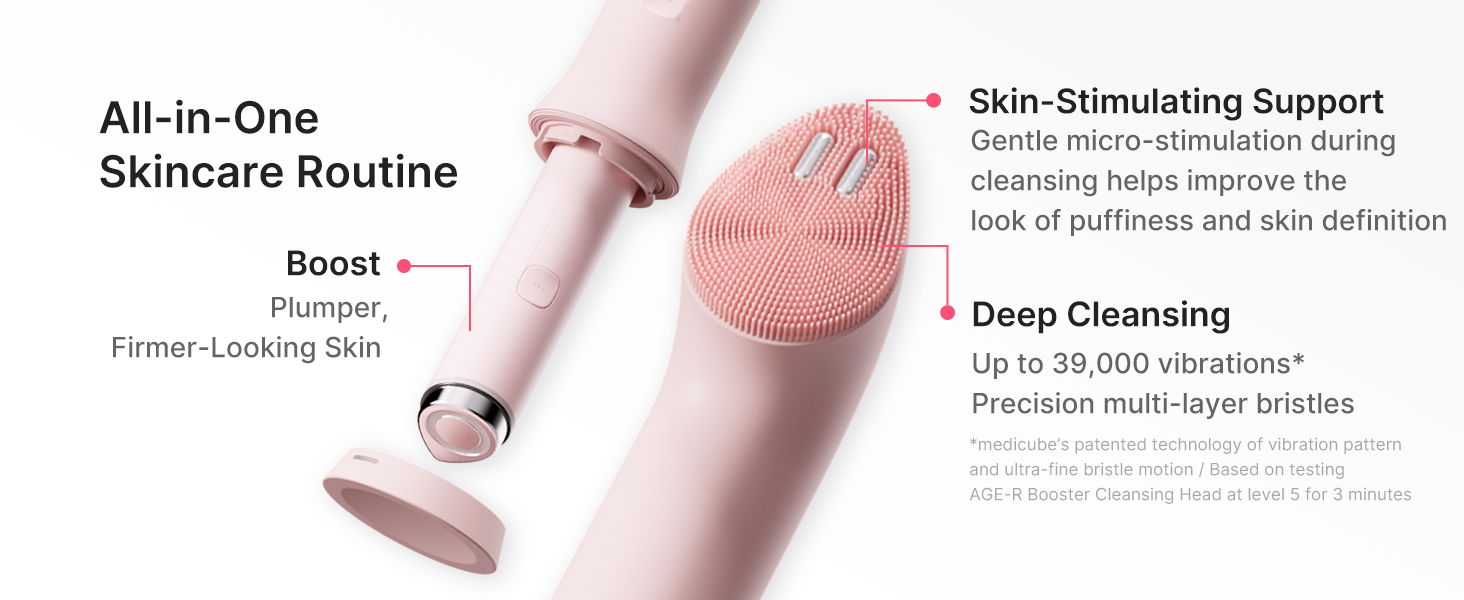 • [MINI BOOSTER PRO PLUS] بعد التنظيف، استخدمي Mini Booster Pro Plus بمفرده للمساعدة في تحسين امتصاص الأمصال والكريمات. قم بتنشيط الوضع الأحمر أو الأزرق أو الأرجواني للعناية باللون والمسام وتحديد البشرة والتوهج - حتى بدون ملحق التنظيف.