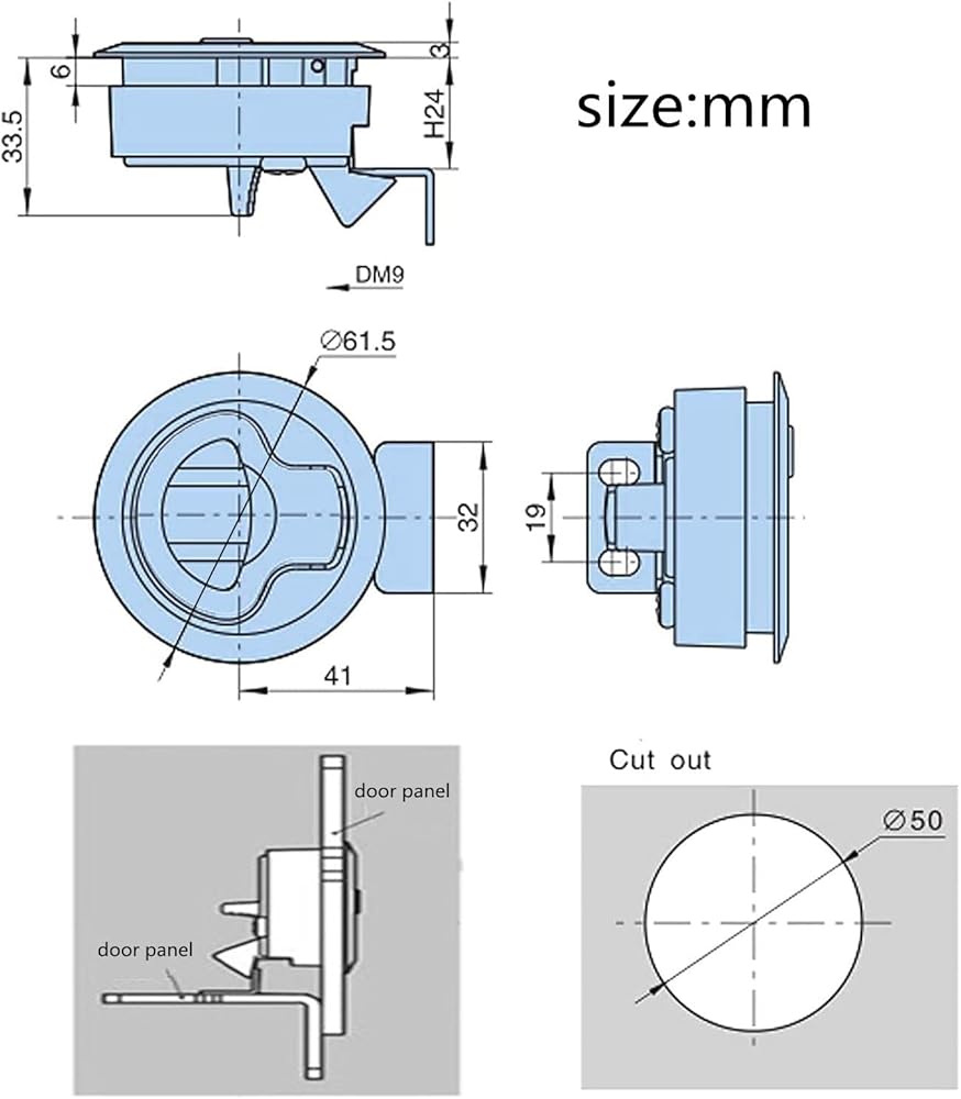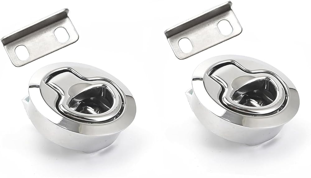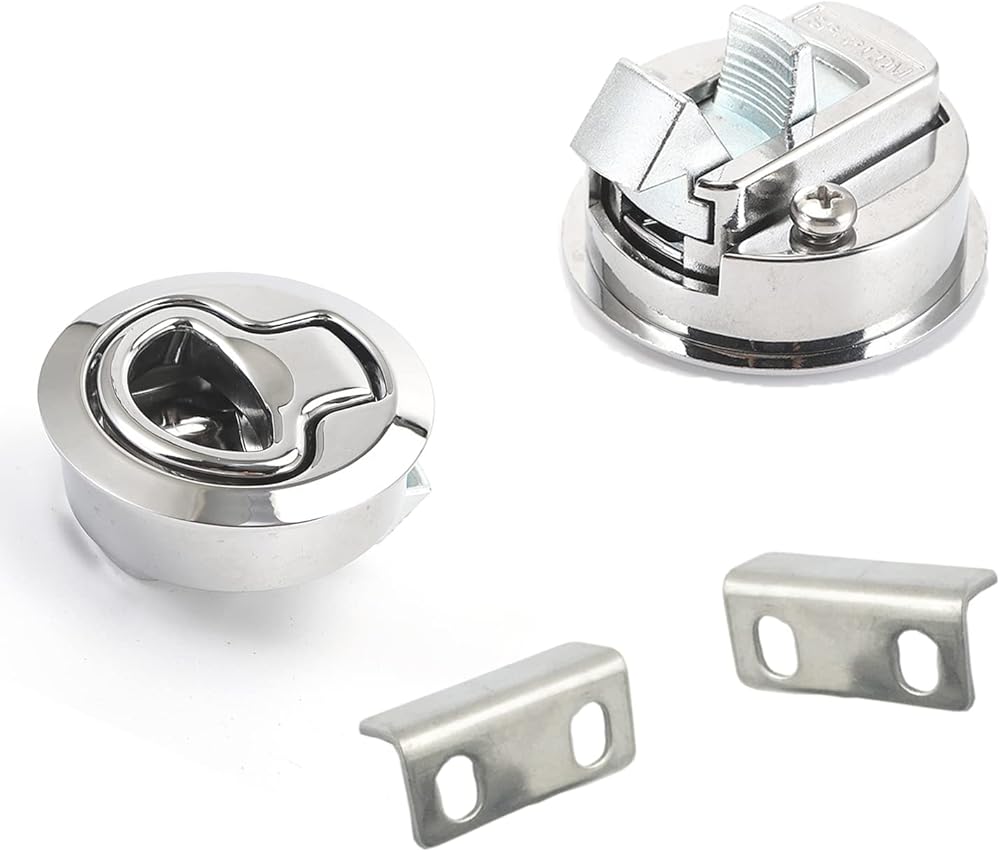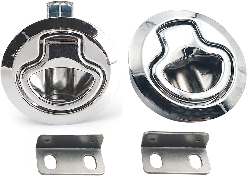 1. Cutout Size: 2inch Diameter Hole. 2. Material/Finish: Stainless Steel.Durable and corrosion resistant plastic to the harsh marine conditions 3. Use:With key Locking for additional security, protective and safe.this latch is widely used by all the major boat and yacht manufacturers, and slam latch is great for new applications as well Easy to install: Marine flush pull hatch latch easy to install,directly replace your worn or broken door latch Color: Silver