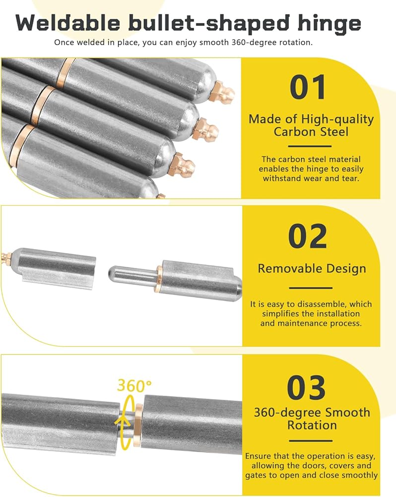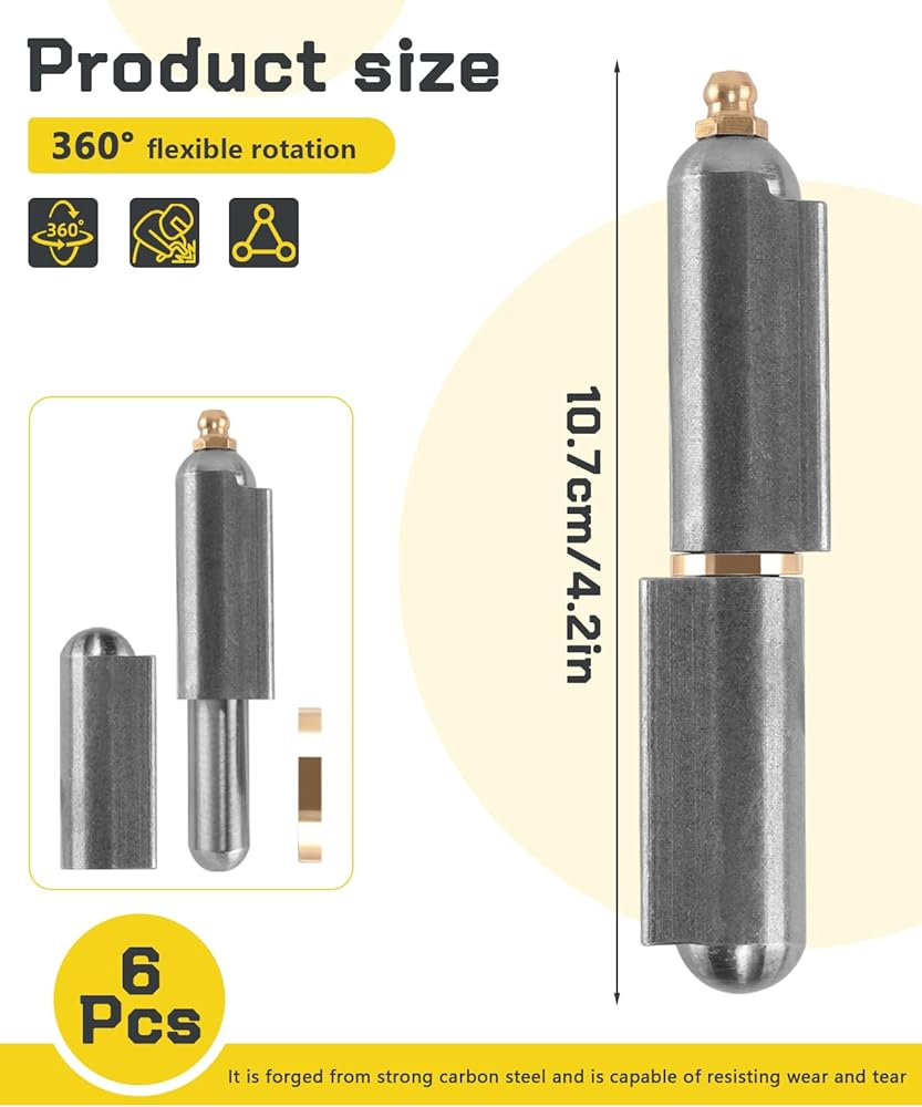 Easy Welding, Quick Installation: Designed for user convenience, each hinge includes a weldable barrel on one end and a pre-drilled fixed plate on the other. Simply weld into place and enjoy instant, silent rotation. Ideal for both DIY enthusiasts and professionals seeking efficiency and precision on the job.