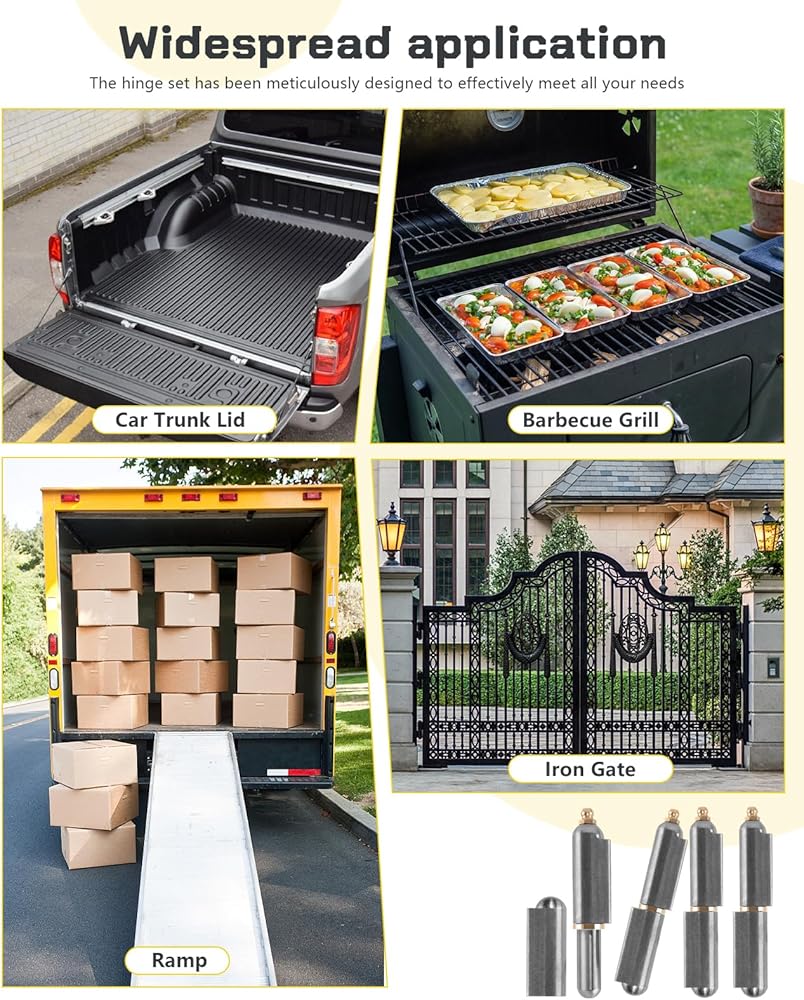 Robust Composition: Whether for vertical swing gates or horizontal drop-down trailers, these hinges deliver consistent performance. Use them on BBQ smokers, car tailgates, access doors, or ramps. Their detachable design adds flexibility for maintenance and repositioning without compromising strength.