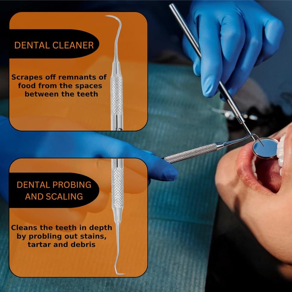 Dental Tartar Scraper Tool – Stainless steel tool designed to help clean away tartar, plaque buildup, food particles, and surface stains.