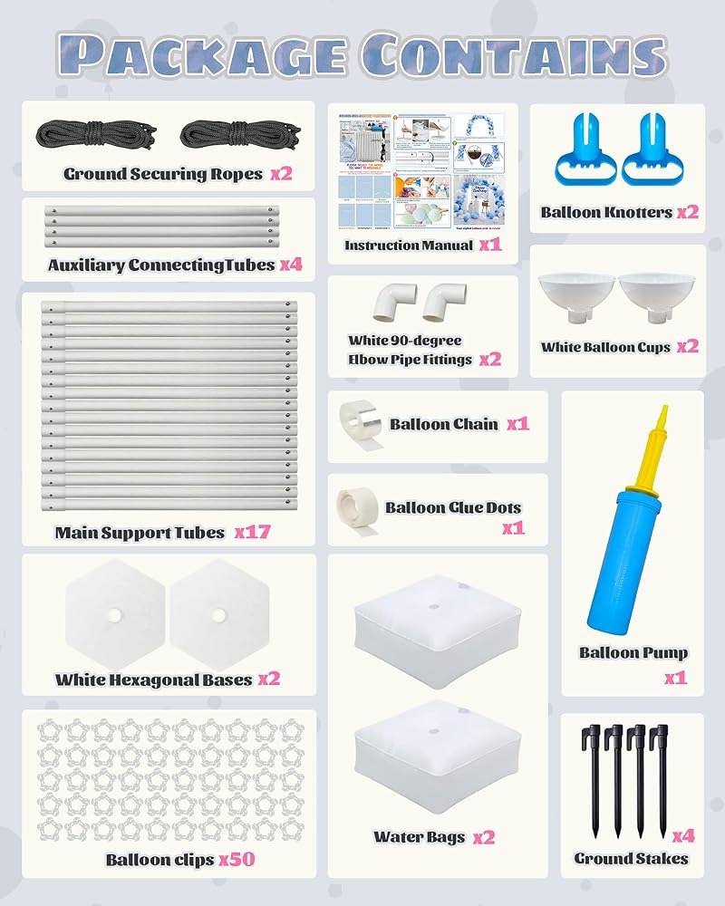 مجموعة احترافية الكل في واحد: احصل على كل ما تحتاجه لإعداد لا تشوبه شائبة في صندوق واحد. تشتمل مجموعة حامل البالونات هذه على: 17 أنبوبًا رئيسيًا، 4 أنابيب توصيل، قاعدتين سداسية، 2 أكياس مياه، 4 أوتاد أرضية، 2 حبال، 2 عقدة بالون، 2 كوب بالون، 1 مضخة بالون، 50 مشبك بالون، 2 تركيبات كوع بيضاء بزاوية 90 درجة، 1 سلسلة بالون، ومجموعة واحدة من نقاط غراء البالونات. لا يتم تشغيل المتجر في اللحظة الأخيرة - يحتوي حامل مجموعة قوس البالون الكامل هذا على كل المكونات للحصول على نتائج احترافية بمجرد إخراجها من الصندوق
