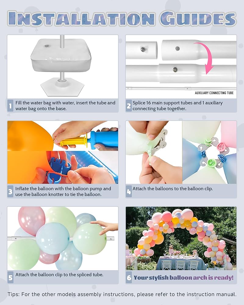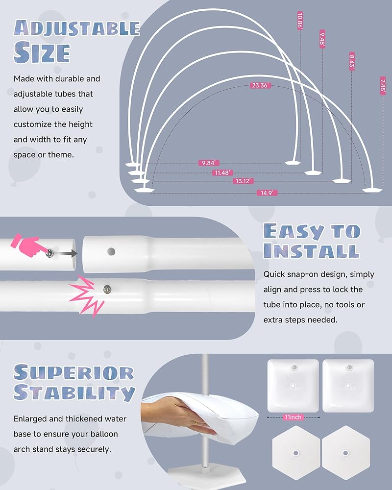 تجميع قابل للتعديل وسهل: اصنع قوس البالونات الذي تحلم به في دقائق! استمتع بالحجم القابل للتخصيص بالكامل من خلال إطارنا المصمم بدقة: قم ببناء أقواس بعرض يتراوح من 9.84 قدمًا إلى 14.9 قدمًا وطول 7.45 قدمًا إلى 10.86 قدمًا، أو قم بإعداد أعمدة بالونية يتراوح ارتفاعها من 6.5 قدمًا إلى 11.68 قدمًا. بفضل دليل واضح خطوة بخطوة ووصلات خالية من الأدوات، يعد إعداد وتفكيك إطار قوس البالون القوي هذا أمرًا بسيطًا للغاية بحيث يمكن لأي شخص الحصول على مظهر مثالي للحفلات دون أي ضغوط.