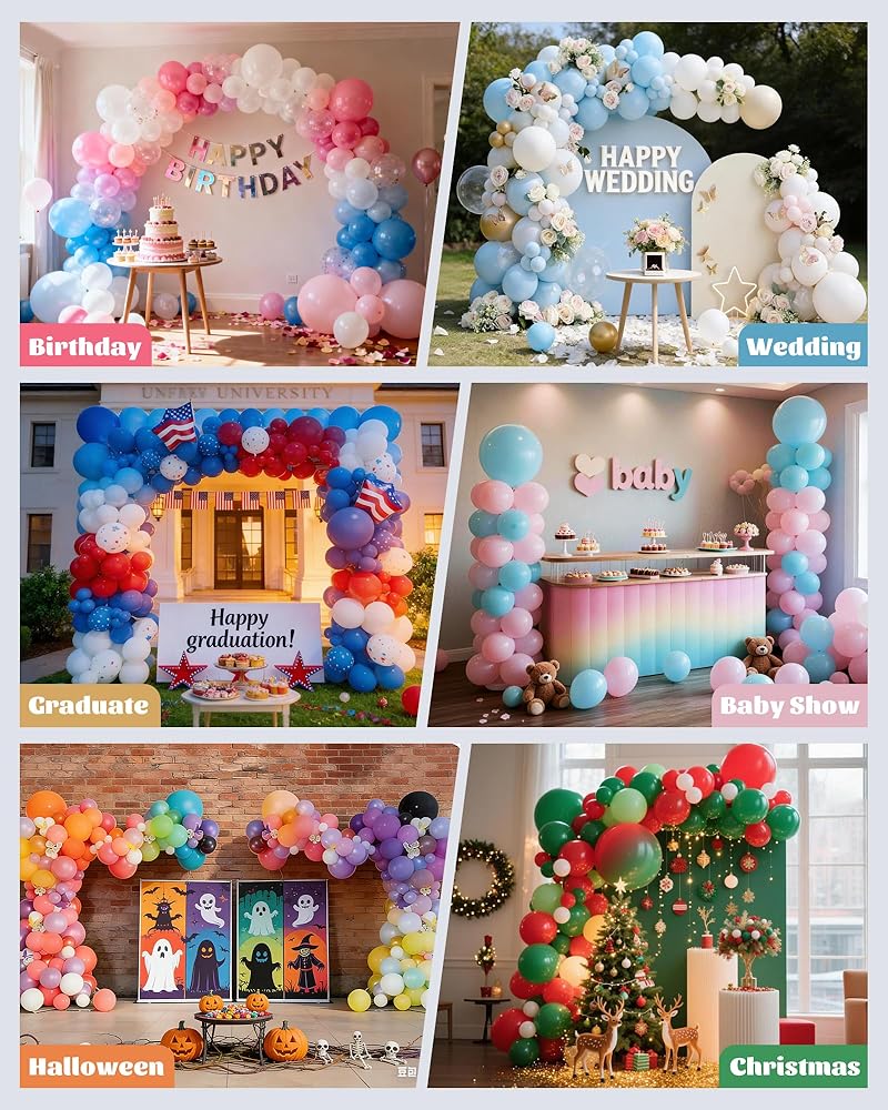 مثالية لكل احتفال: من أعياد الميلاد وحفلات الزفاف إلى حفلات استقبال الأطفال والخطوبة والتخرج والعطلات الموسمية مثل عيد الميلاد أو الهالوين، هذه هي الخلفية المثالية لقوس البالون. قم بإنشاء مدخل مذهل أو جدار صور رائع. تصميمه القابل للتكيف يجعله قوسًا مثاليًا للبالونات في أي مناسبة، مما يضمن أن ديكورك يسرق العرض وذكرياتك مثالية للصور
